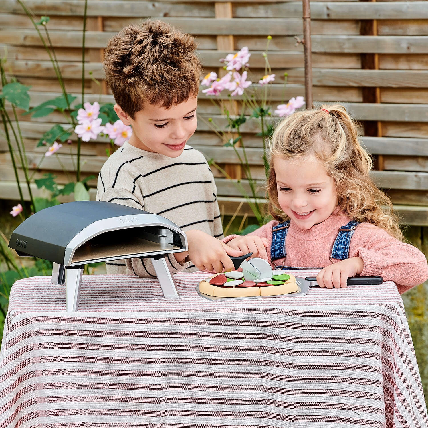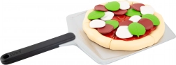 Lopata practică pentru pizza și tăietorul facilitează manipularea. Îmbinările felilor de pizza mențin piesele împreună – ideal pentru mânuțe mici.