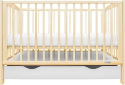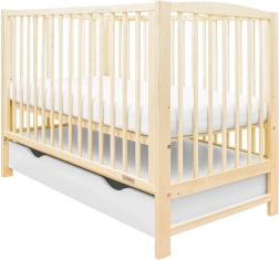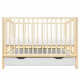 Rama și lateralele sunt fabricate din lemn de pin 100% provenit din surse certificate FSC și tratate cu lac pe bază de apă, sigur pentru copii și pentru mediu. Sertarul integrat pe glisiere cu bile oferă spațiu de depozitare practic pentru trusou, este ușor accesibil și nu atinge podeaua.