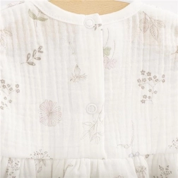 Închiderea cu capsă la spate face îmbrăcarea ușoară chiar și pentru bebeluși de 0–3 luni. Muselinul este în mod natural rezistent și cu fiecare spălare devine încă și mai moale, astfel încât rochița rămâne frumoasă și confortabilă mult timp.