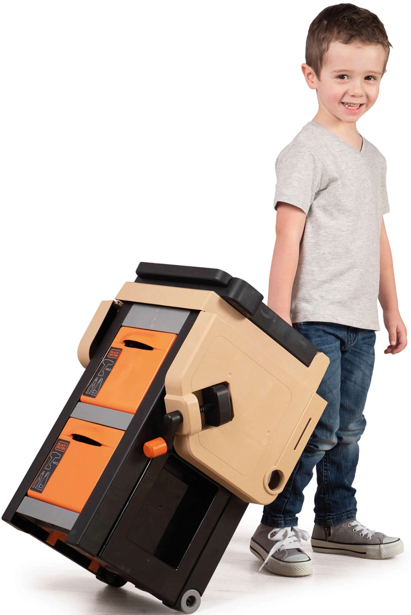 Bancul de lucru deschis Bricolo este realizat sub licența BLACK+DECKER, permițând copiilor să lucreze cu scule care arată ca cele reale. Blatul robust cu imitație de lemn, suportul și pegboard-ul pentru unelte, sertarele și rafturile mențin toate piesele bine organizate. Bancul este fabricat cu accent pe calitate și durabilitate, rezistând jocului zilnic.