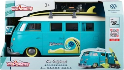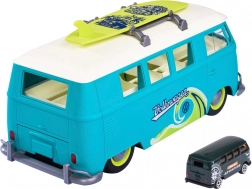 Marele Volkswagen T1 interactiv de la MAJORETTE impresionează prin execuția precisă și detaliile autentice ale legendarului camper. Suportul sub formă de dubă în nuanțe albastru-verde cu elemente crem se deschide într-o geantă de joacă practică, cu locuri de parcare pentru mașinuța inclusă. Butonul frontal în forma logo-ului VW activează lumini puternice.