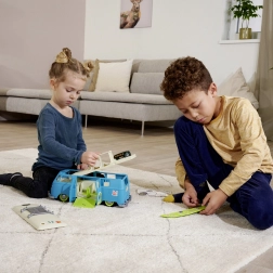 Acoperișul este detașabil, pe suport găsești o placă de surf detașabilă, iar partea din spate are un capac rabatabil cu spațiu „motor”. Construcția durabilă din plastic este potrivită pentru joaca de zi cu zi și dezvoltă motricitatea fină și imaginația copiilor de la 3 ani.