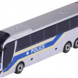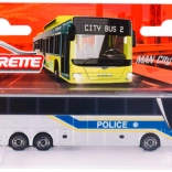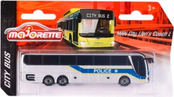 Model metalic de autobuz MAN Lion's City C în versiune de poliție, care va încânta atât micii, cât și marii colecționari. Finisaj gri cu dungă albastră, caroserie metalică de calitate cu detalii din plastic și roți liber rotative pentru rulare lină pe suprafețe drepte. Calitate verificată a mărcii Majorette din seria Majorette Trailer.
