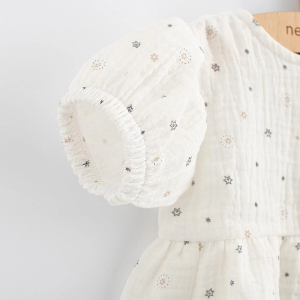 Rochiță din muselin ușoară și respirabilă pentru bebeluși NEW BABY Zora, croială comodă în A cu mânecă scurtă și fustiță încrețită. Închiderea frontală cu nasturi facilitează îmbrăcarea, iar muselinul din bumbac 100% este delicat cu pielea sensibilă a copilului. Ideală pentru vară și zilele călduroase, cu respirabilitate ridicată și rezistență la spălări frecvente.
