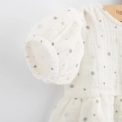 Închiderea practică cu nasturi în partea din față facilitează îmbrăcarea. Rochia este realizată din muselin de calitate, din 100% bumbac, plăcut chiar și pentru pielea sensibilă a copiilor, rezistă la spălări frecvente și devine și mai moale în timp.