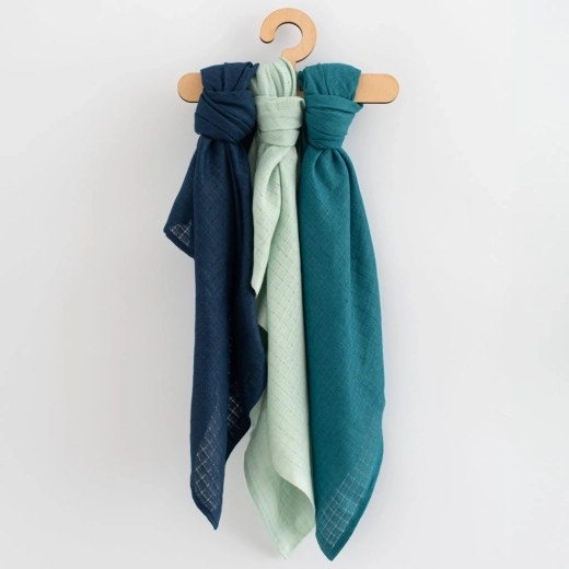 Set practic de trei scutece pentru copii NEW BABY din 100% bumbac, cu dimensiunea de 70 × 80 cm, ideal pentru îngrijirea zilnică a bebelușului. Oferă finețe, respirabilitate și absorbanță ridicată, sunt blânde cu pielea sensibilă și sunt armonizate cromatic pentru băieți. Excelente pentru înfășat, sub căpușor în pătuț sau cărucior și ca ajutor universal în trusou.