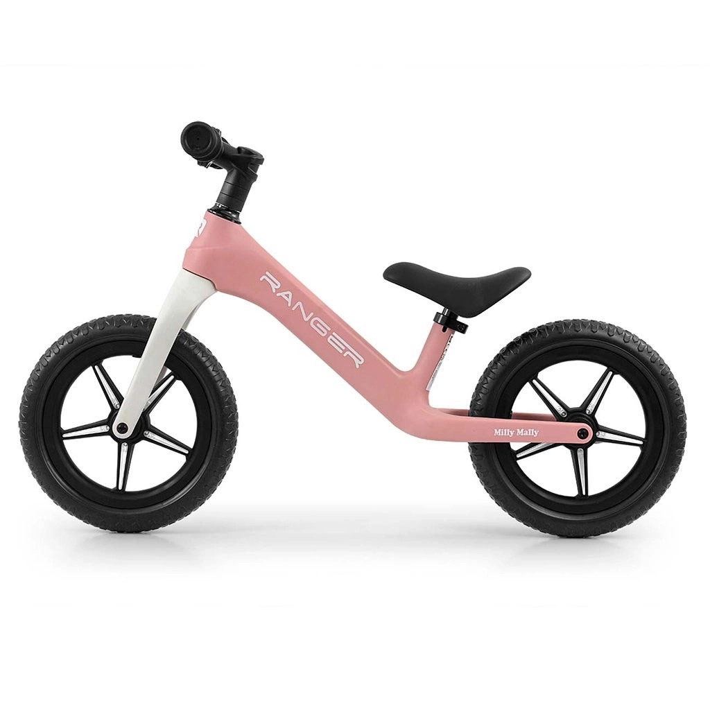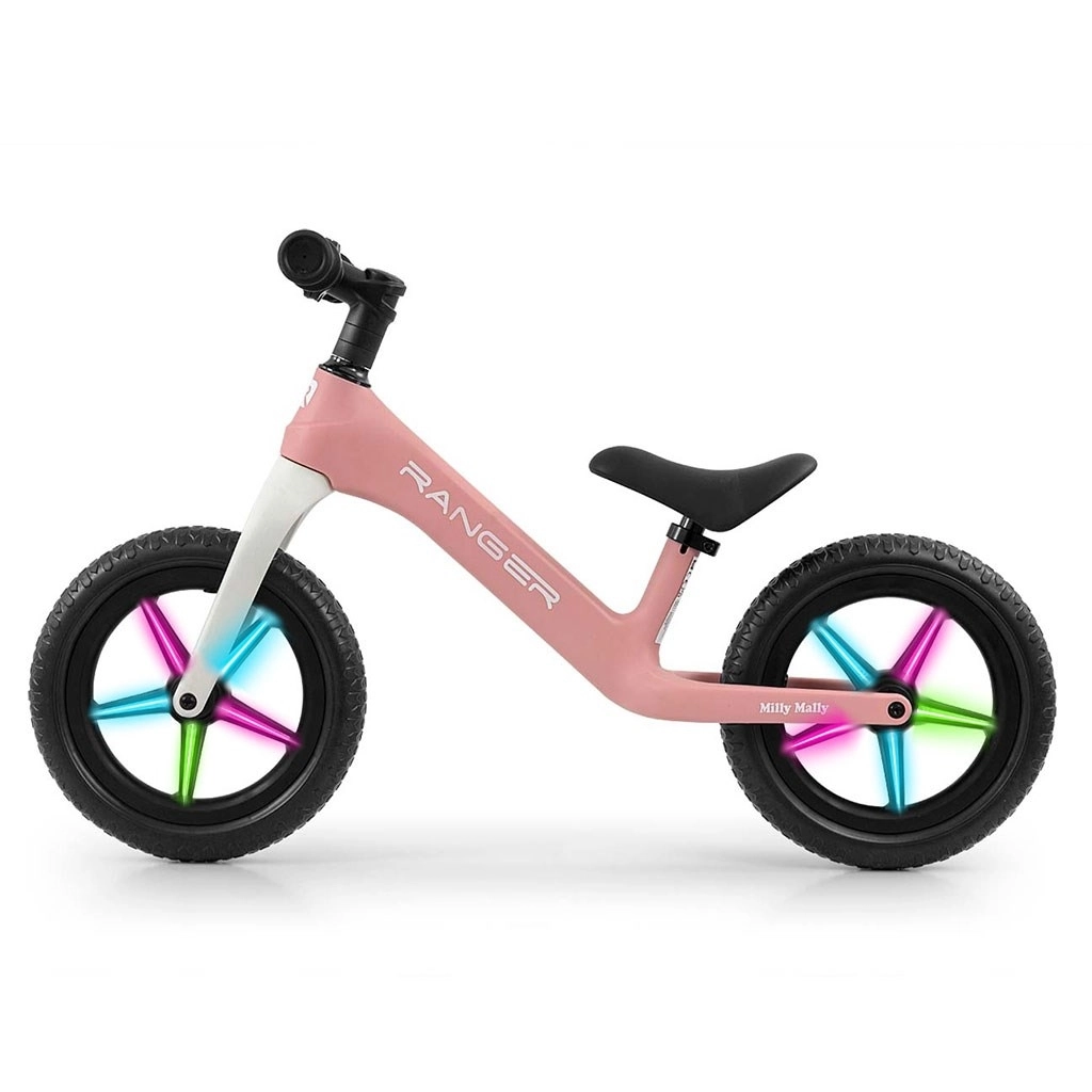 Bicicleta de echilibru ușoară MILLY MALLY Ranger Flash, în culoare roz, îi ajută pe copii să-și dezvolte echilibrul și coordonarea înainte de a trece la bicicleta cu pedale. Oferă un cadru compozit, roți EVA de 12″ fără întreținere și înălțime reglabilă a șeii pentru confort și pentru a crește odată cu copilul. Ghidon și roți pe rulmenți, mânere moi antiderapante și iluminare LED a spițelor jantelor sporesc siguranța și distracția la mers.