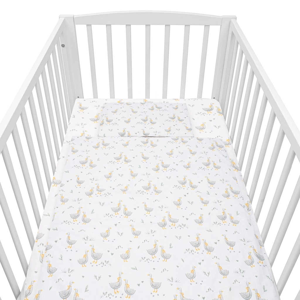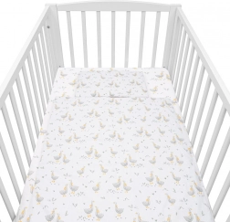 Setul pentru pătuț NEW BABY Găscuțe încântă prin materialul plăcut și designul drăguț. Husa este din bumbac 100% fin, iar umplutura este din fibră goală anti-alergică cu grosime de cca 3 cm, care încălzește și în același timp permite o bună circulație a aerului. Datorită execuției rezistente, dar delicate, setul este potrivit pentru utilizare zilnică și pentru pielea sensibilă a copiilor.
