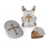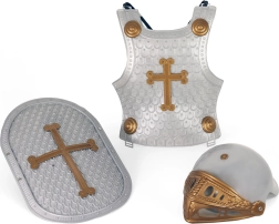 Setul include tot ce micuții cavaleri au nevoie pentru a-și îndeplini visele eroice – o sabie cu teacă, un scut, o cască și o vestă.