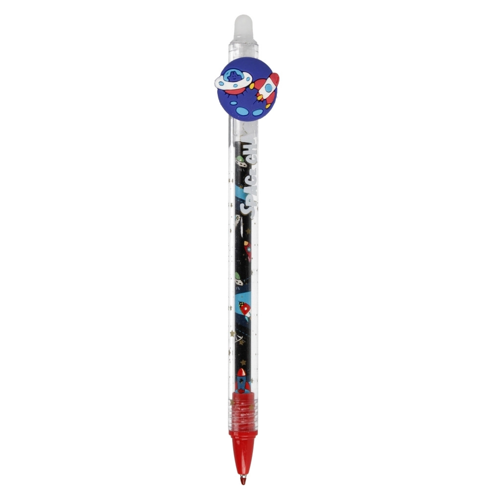Corpul transparent cu planete, rachete și sclipici este completat de un topper distractiv – pixul devine un accesoriu stilat pentru penar.