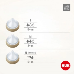 Practic, indicatorul de temperatură NUK dintre gradații funcționează ca un termometru – când conținutul este prea fierbinte devine alb, iar la temperatura ideală (aprox. 37 °C) rămâne albastru. Biberonul este din polipropilenă fără BPA rezistentă și indestructibilă, plăcut la atingere, cu prindere sigură și bază largă stabilă.