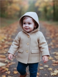 Haină de toamnă NEW BABY UNI cu glugă, stilată și confortabilă, pentru băieți și fete. Oferă croială universală, țesătură mai călduroasă potrivită și pentru ierni blânde și căptușeală din bumbac de calitate pentru purtare plăcută. Nasturii din lemn adaugă un aspect elegant, iar gluga protejează fiabil împotriva vântului rece.