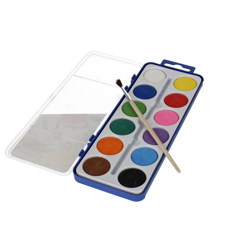 Set practic de acuarele cu pensulă pentru mici și mari artiști. Conține 12 culori intense într-o casetă compactă cu dimensiunile 8 × 22 × 1 cm. Ideal pentru copii de la 3 ani, pentru creații acasă și pentru orele de arte la școală.