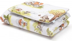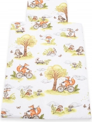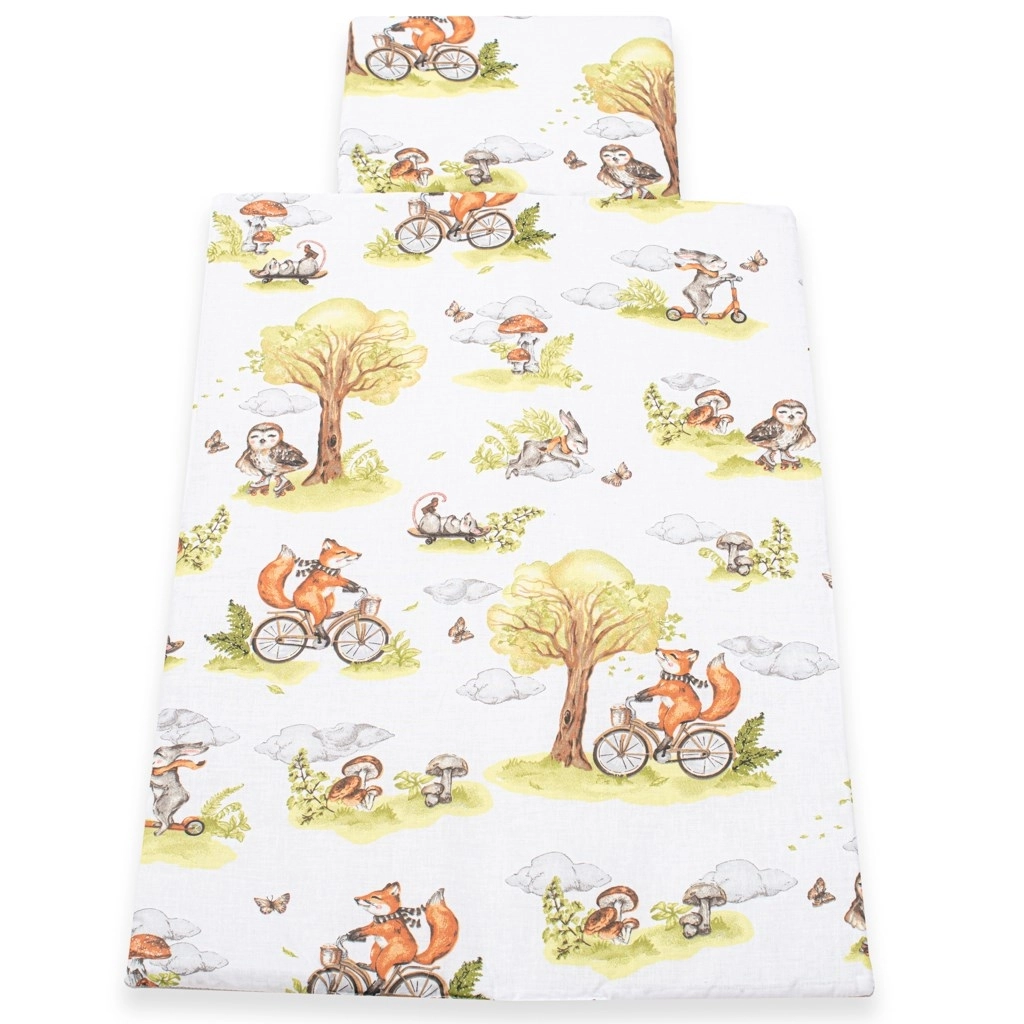 Acest set dublu-față pentru cărucior îmbină practicitatea cu un design delicat. O față este din bumbac fin 100% cu imprimeu liniștitor cu animale din pădure, cealaltă din catifea moale, care încălzește, este plăcută la atingere și își păstrează forma. Ideal de la naștere: pentru somn, în cărucior, în scaunul auto sau ca pătură de joacă.