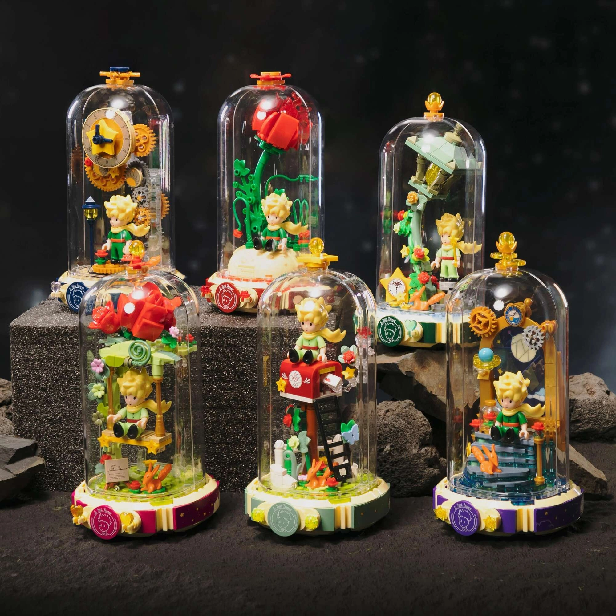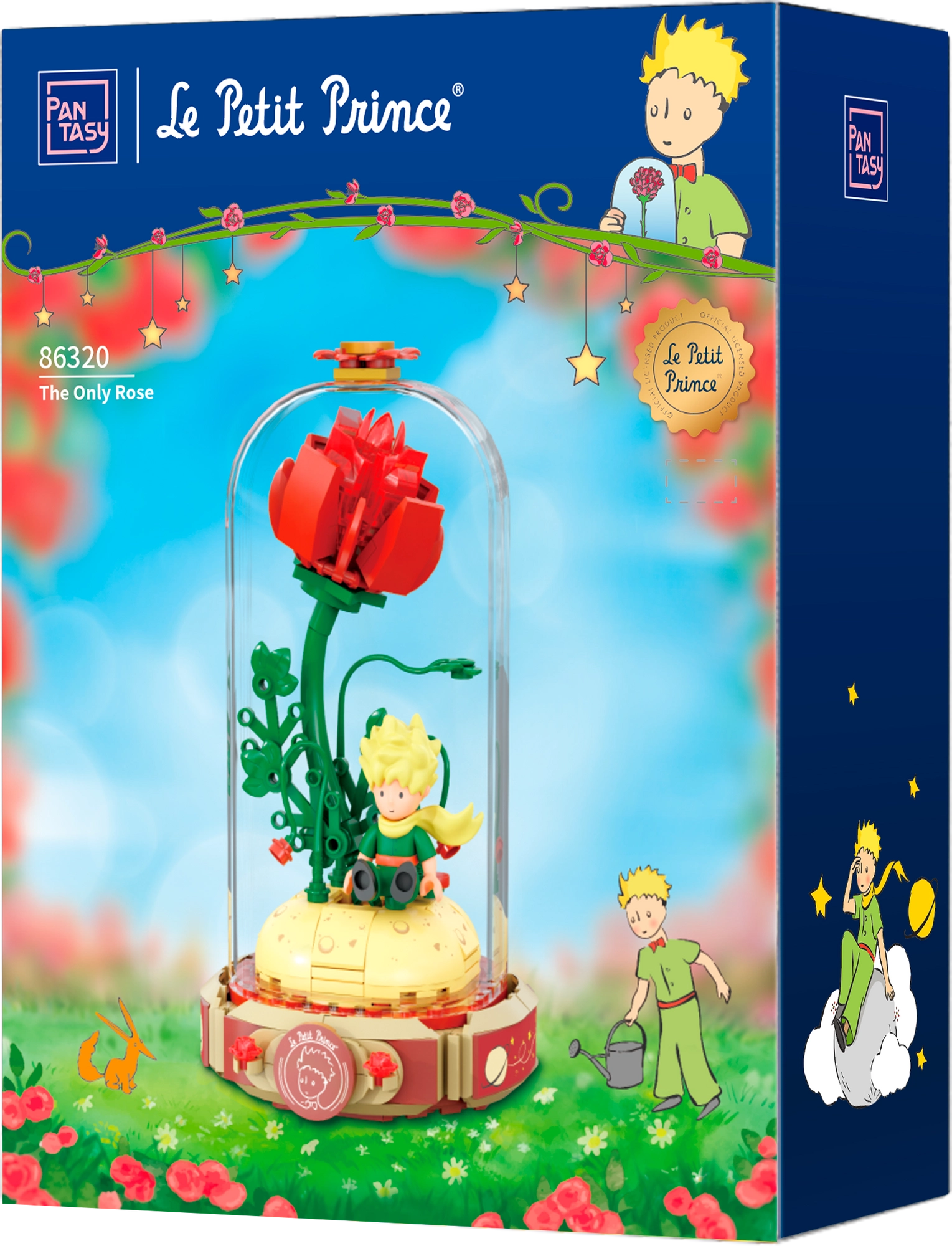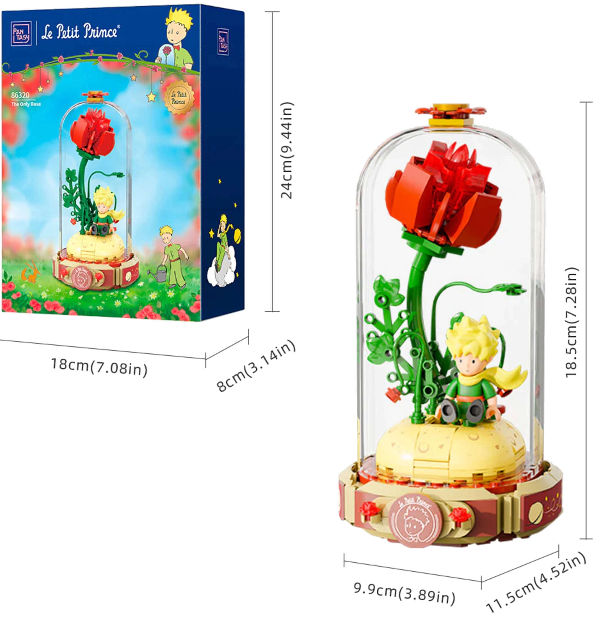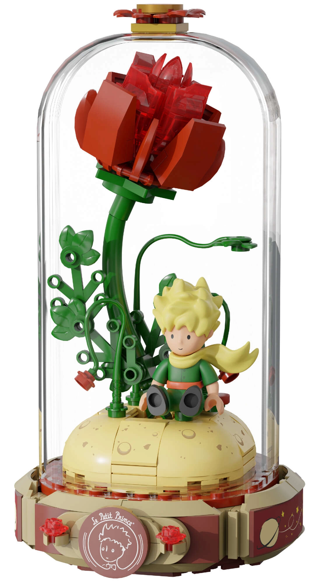Construiește simbolicul trandafir roșu pe un suport în forma unei cărți deschise cu inscripția „Le Petit Prince”. Alături se află Micul Prinț și vulpea în postura lor tipică. Detaliile rafinate ale tulpinilor, frunzelor și florilor conferă modelului armonie și eleganță – o piesă grozavă pentru expunere și joacă creativă.