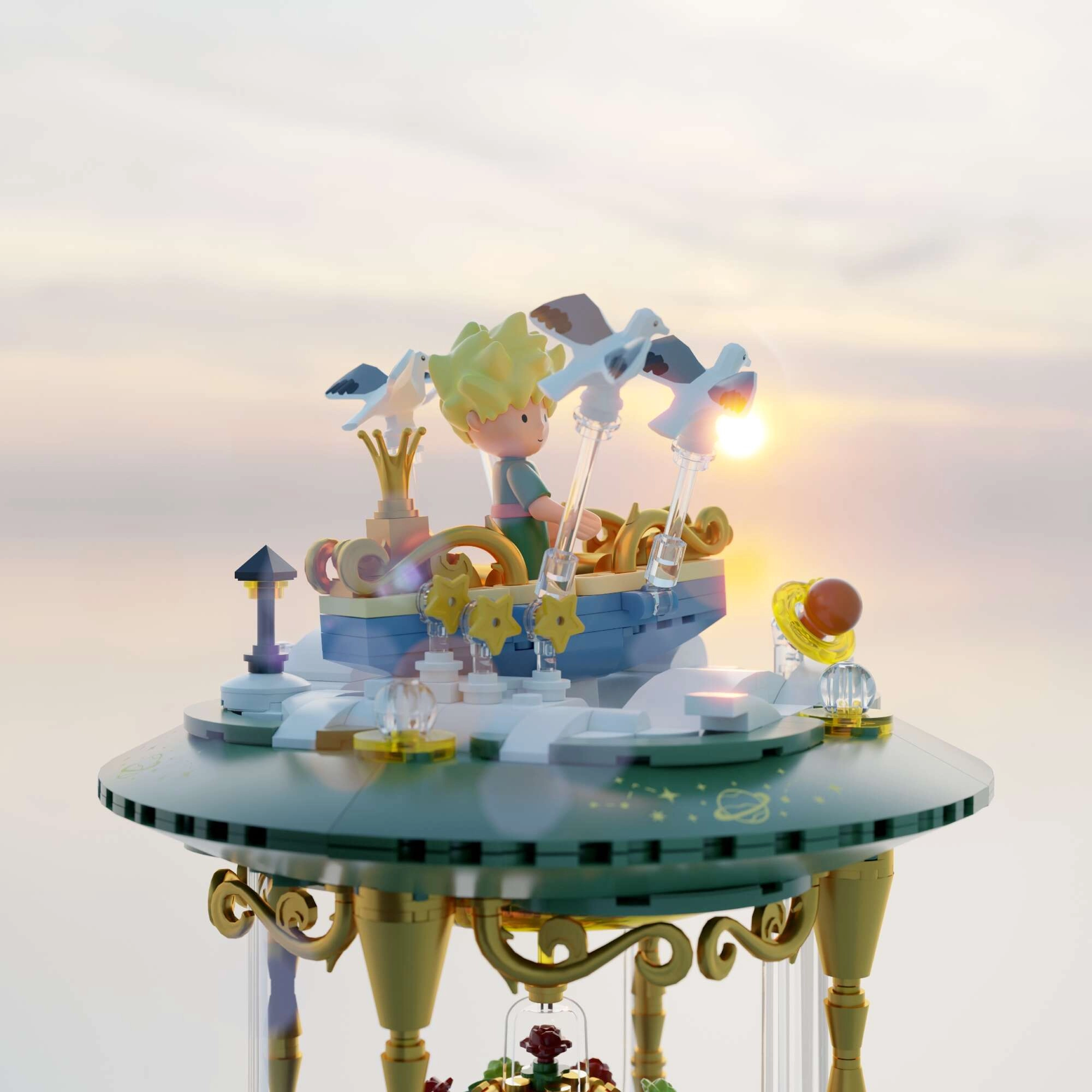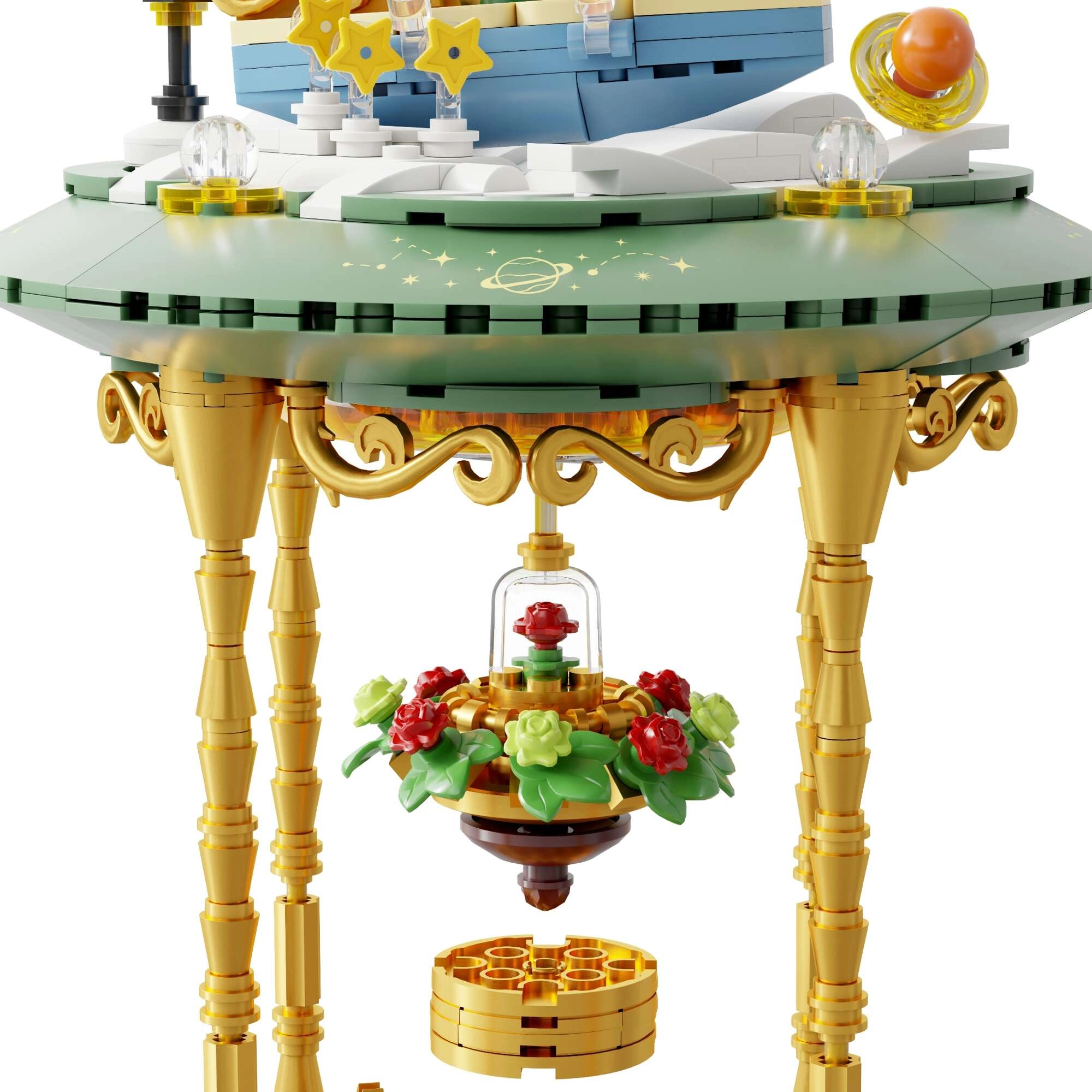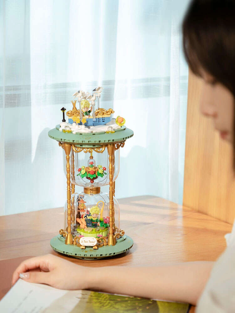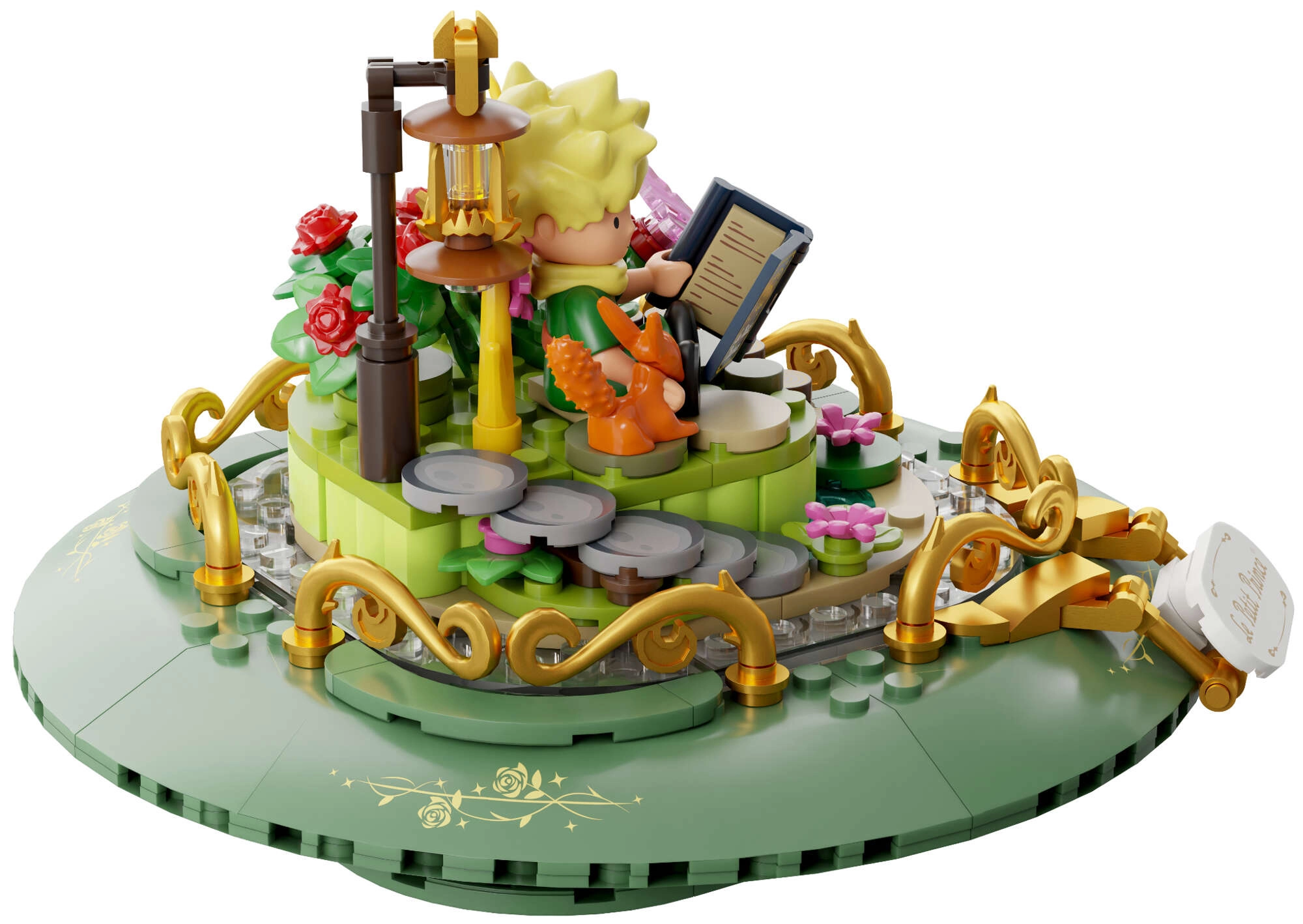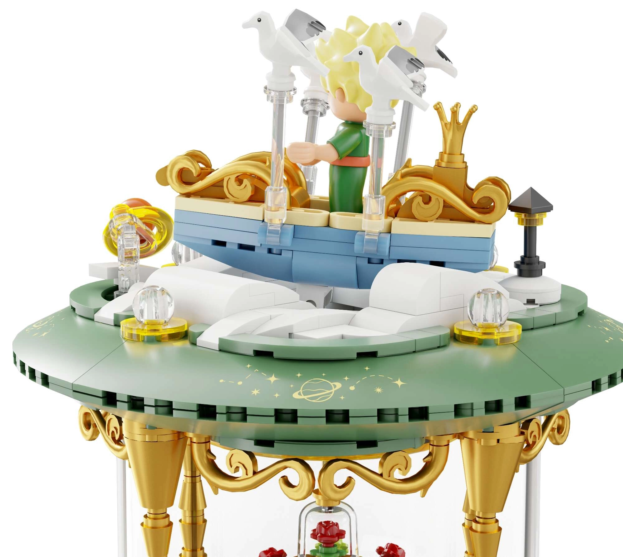 Acest set de expunere în forma unei clepsidre stilizate îmbină poezia operei atemporale cu designul modern. Suporturile verzi, stâlpii aurii și camerele transparente cu mini-scenete creează o dioramă spectaculoasă – Micul Prinț, vulpea, trandafirul sub clopot de sticlă și cerul înstelat. Datorită îmbinării precise a cărămizilor și modelor imprimate, modelul își păstrează aspectul curat mulți ani.