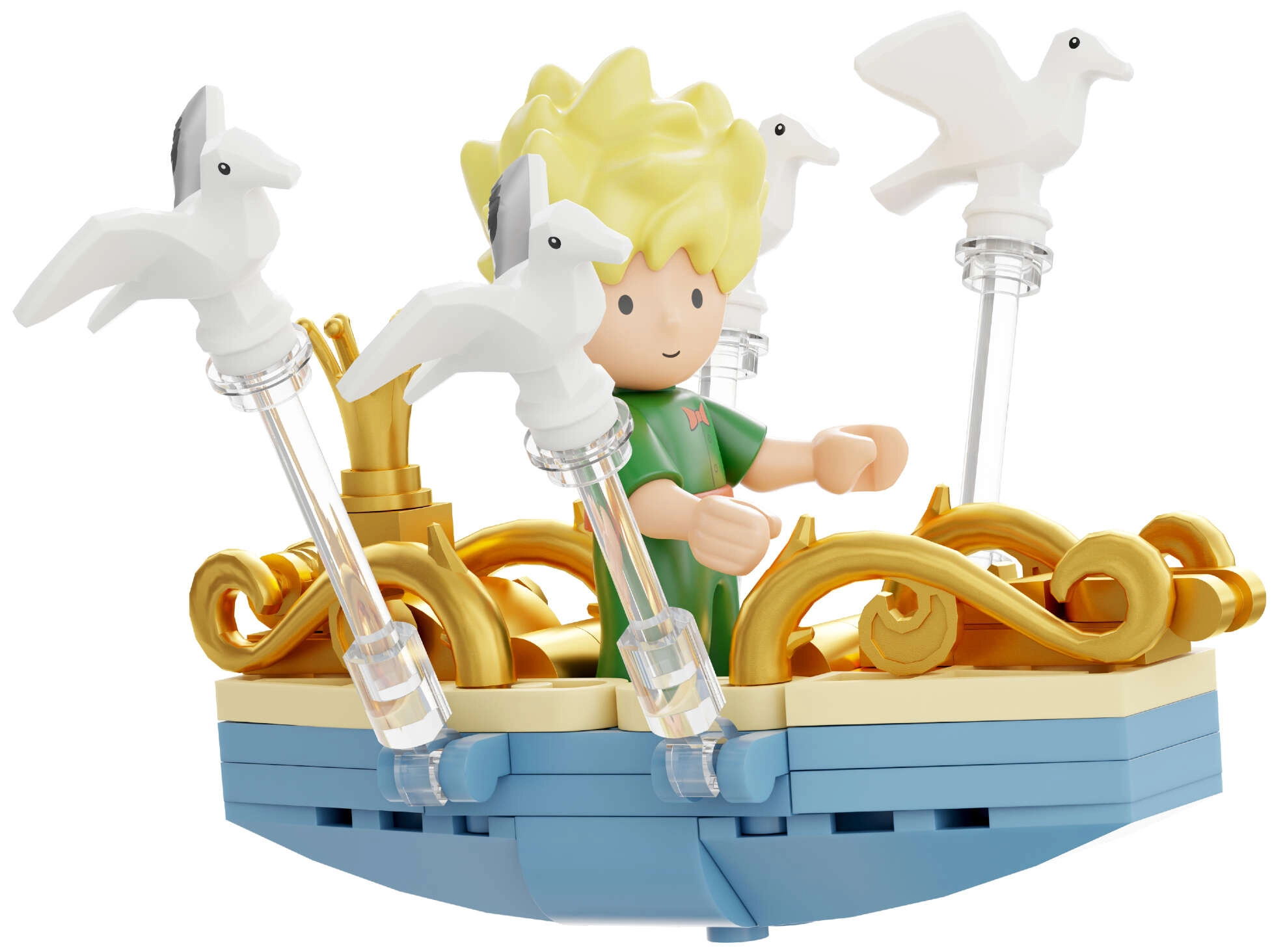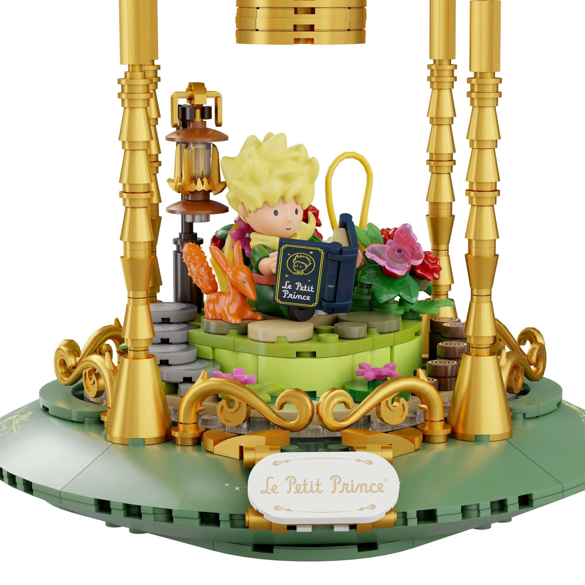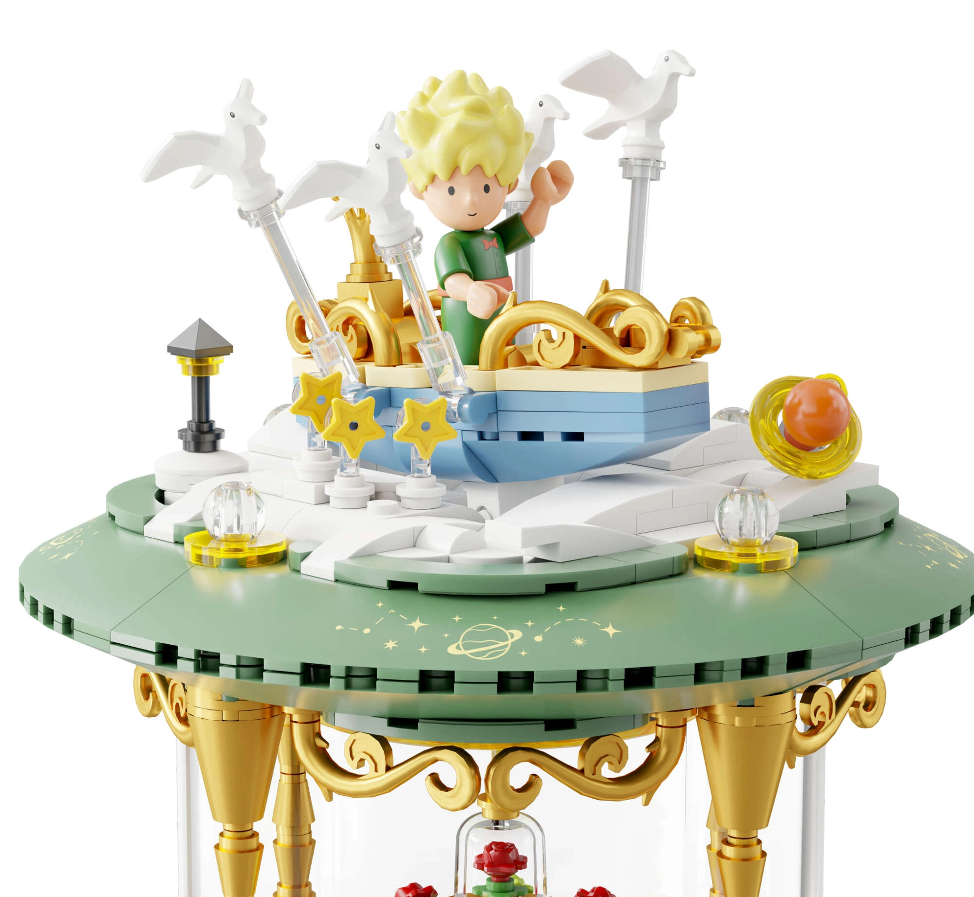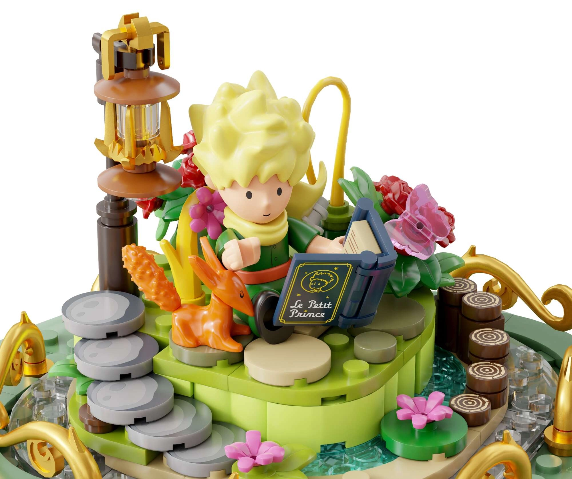 Acest set de expunere în forma unei clepsidre stilizate îmbină poezia operei atemporale cu designul modern. Suporturile verzi, stâlpii aurii și camerele transparente cu mini-scenete creează o dioramă spectaculoasă – Micul Prinț, vulpea, trandafirul sub clopot de sticlă și cerul înstelat. Datorită îmbinării precise a cărămizilor și modelor imprimate, modelul își păstrează aspectul curat mulți ani.