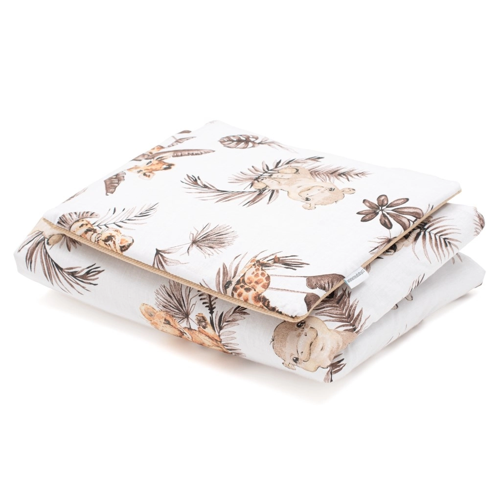 Setul reversibil NEW BABY Safari pentru cărucior este conceput pentru confort încă de la naștere. O parte din 100% bumbac cu imprimeu safari adorabil este plăcută la atingere și respirabilă, iar cealaltă parte din velvet foarte moale oferă căldură și își păstrează forma pe termen lung. Păturica este completată de panglici colorate care atrag atenția bebelușului și îi stimulează percepția.