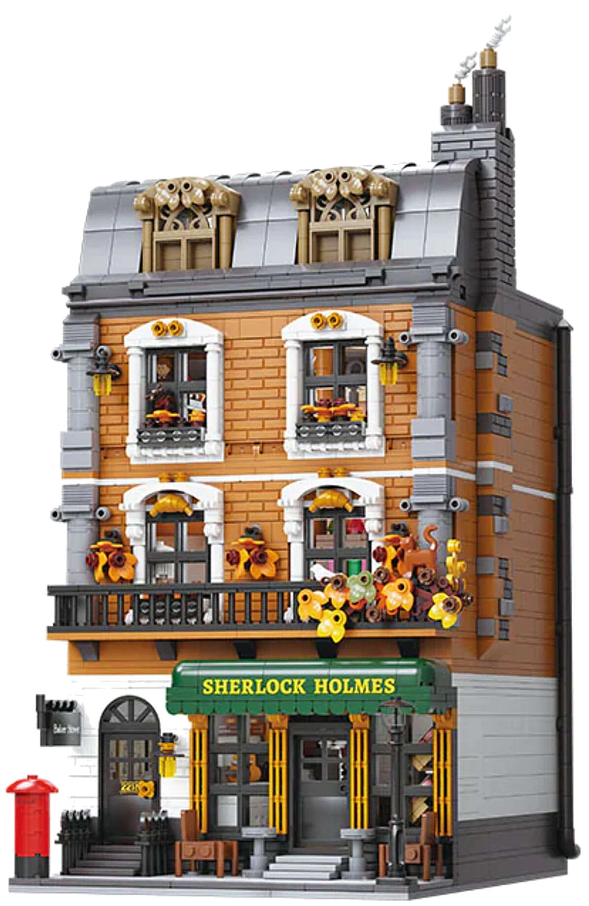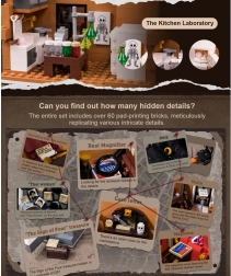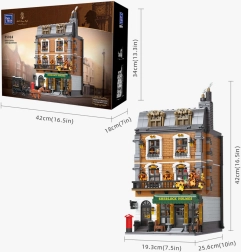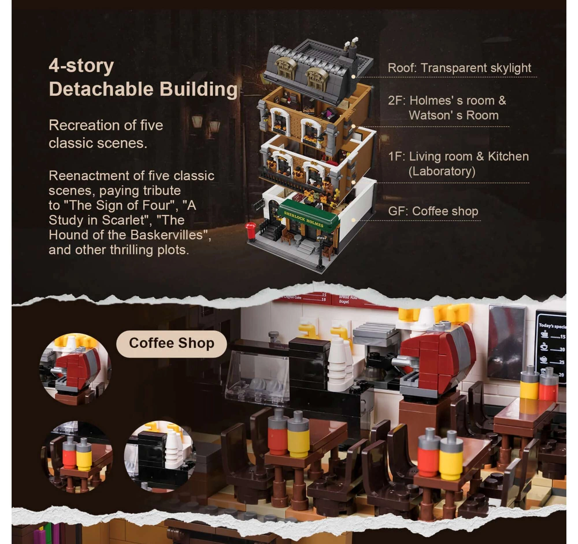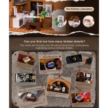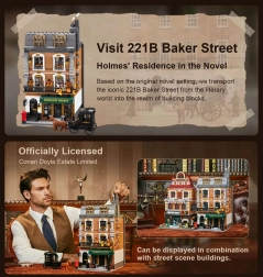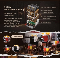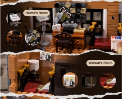 Modelul casei urbane cu patru etaje surprinde fidel atmosfera Londrei victoriene. Vei găsi un salon primitor cu biblioteci, barul cafenelei 221B, dormitorul lui Holmes cu ziare și violoncel și biroul plin de artefacte. Datorită celor peste 60 de cărămizi imprimate special cu motive din Londra, Watson și hărți, te vei bucura de autenticitate maximă fără a fi nevoie de abțibilduri.