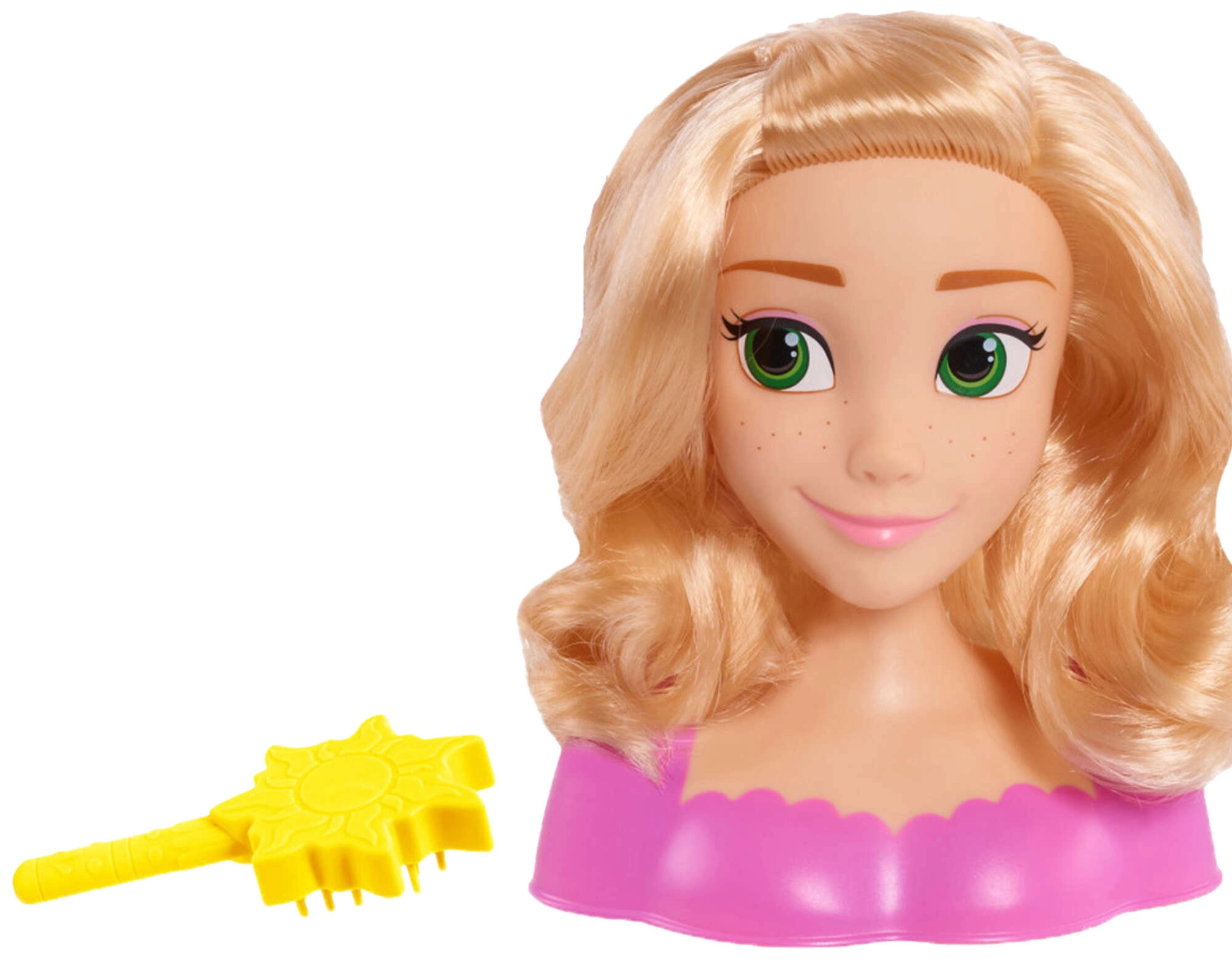 Descoperă capul de coafat magic cu motivul prințesei Disney Rapunzel, inspirat de filmul O poveste încâlcită. Părul blond lung poate fi pieptănat, stilizat și decorat cu ajutorul periei în formă de soare incluse. O jucărie grozavă pentru copii de la 3 ani, care susține creativitatea, motricitatea fină și imaginația.
