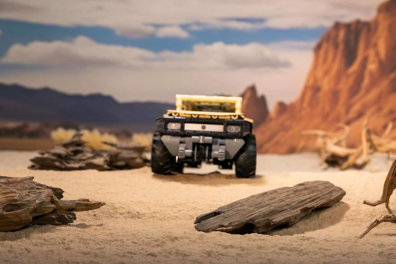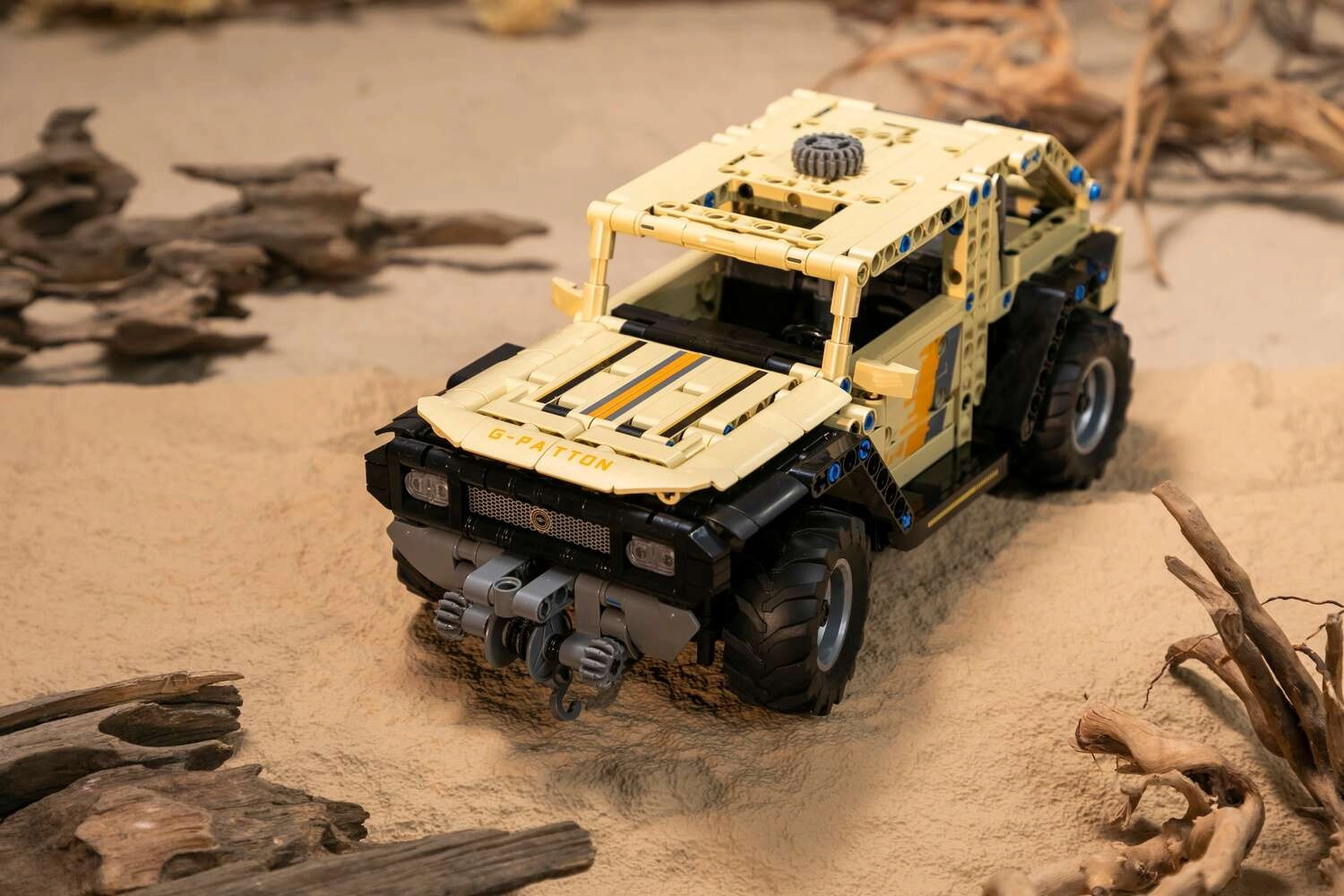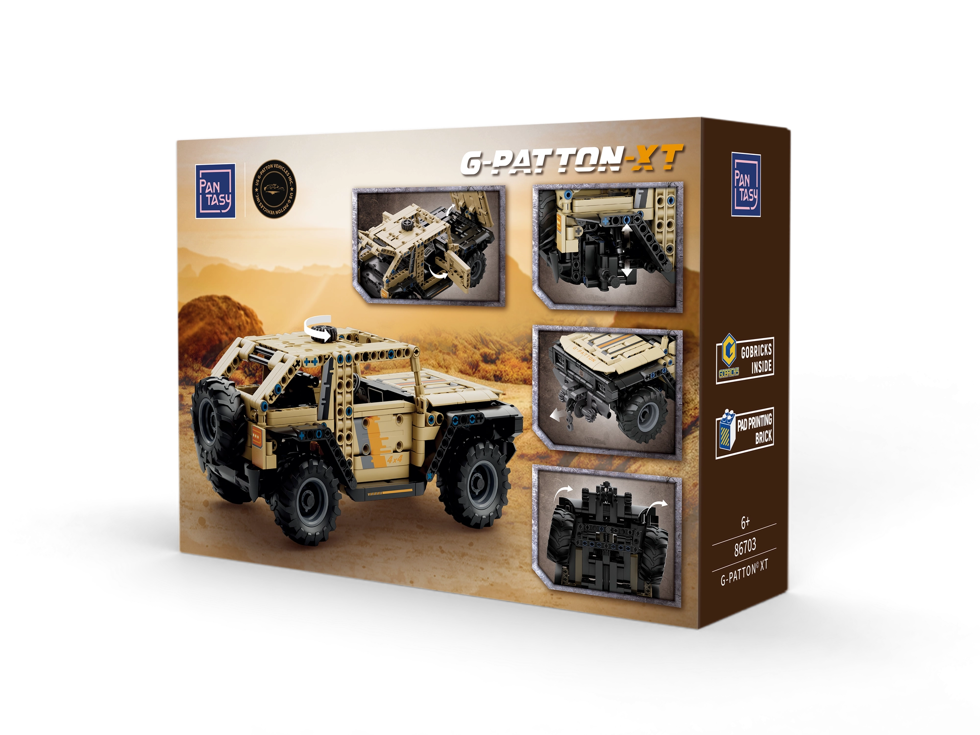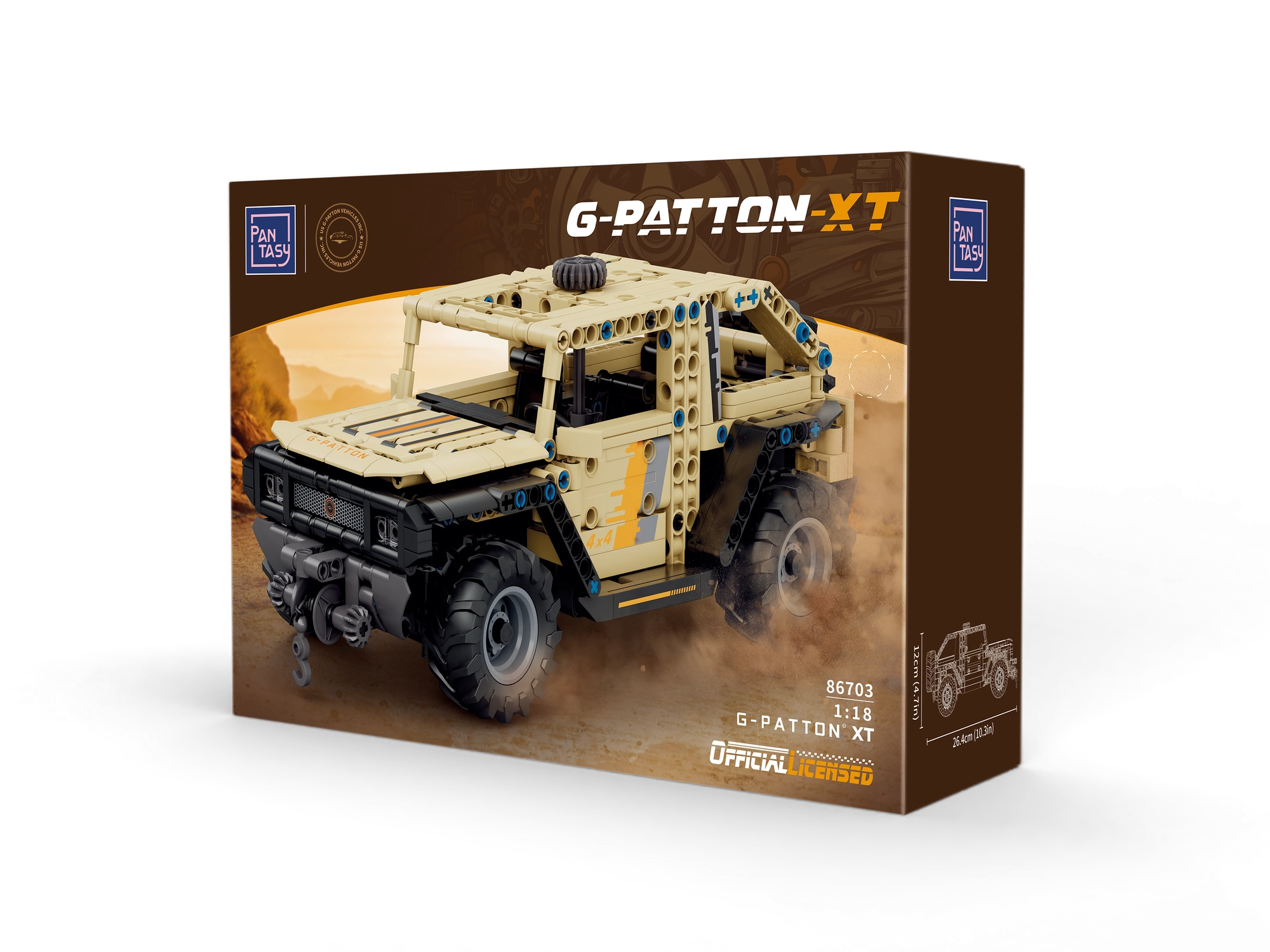 PANTASY G-Patton XT la scara 1:18 se remarcă prin aspectul „desert” nisipiu, roțile masive și cadrul caroseriei deschis pentru un look tehnic autentic. Datorită ușilor care se deschid, troliului funcțional și controlului roților printr-un element de pe acoperiș, te bucuri de scenarii reale de salvare și condus în teren. Cockpitul interior și elementele caroseriei sunt atent realizate pentru impact vizual maxim.