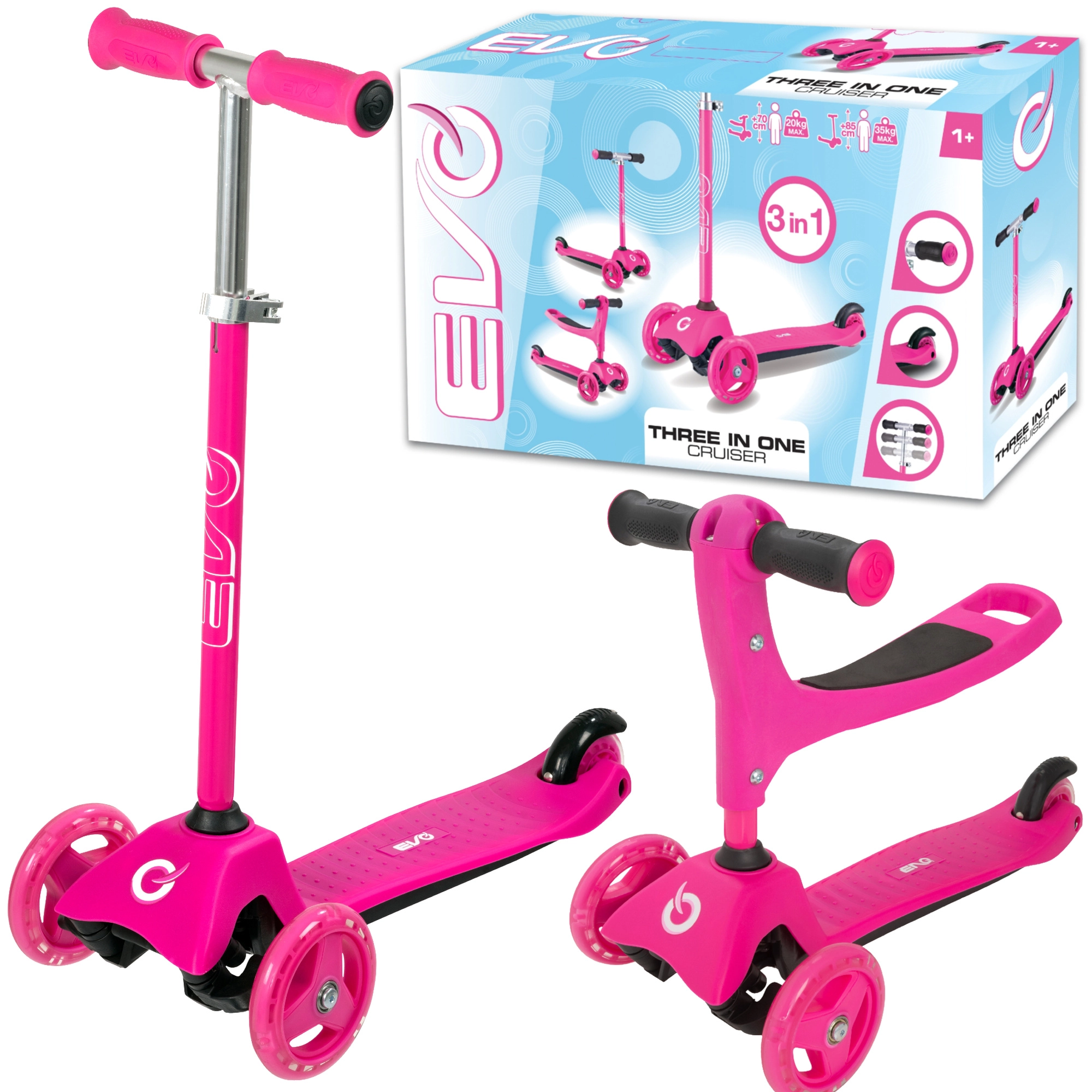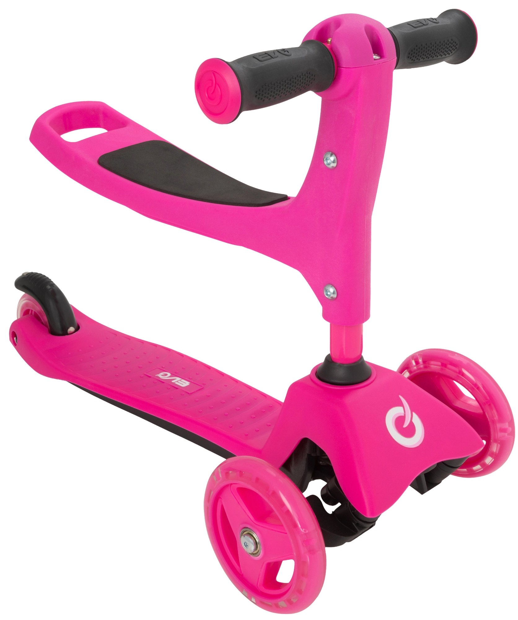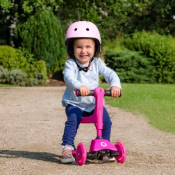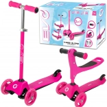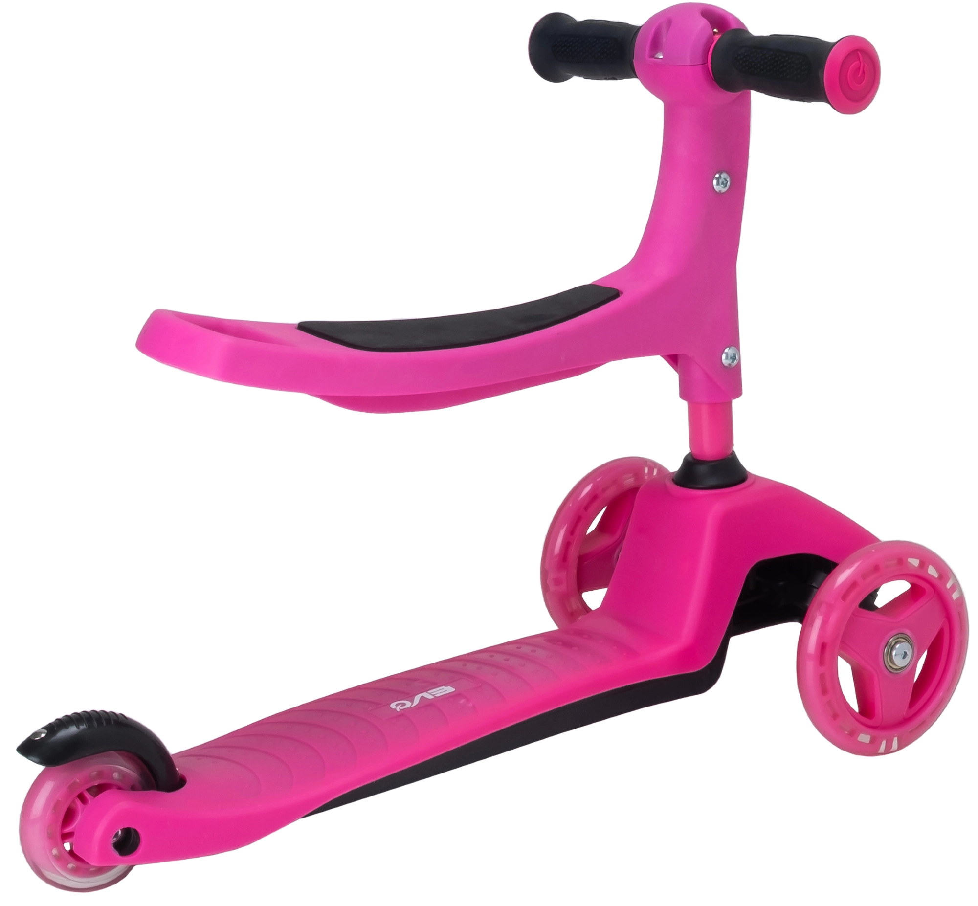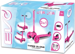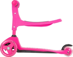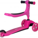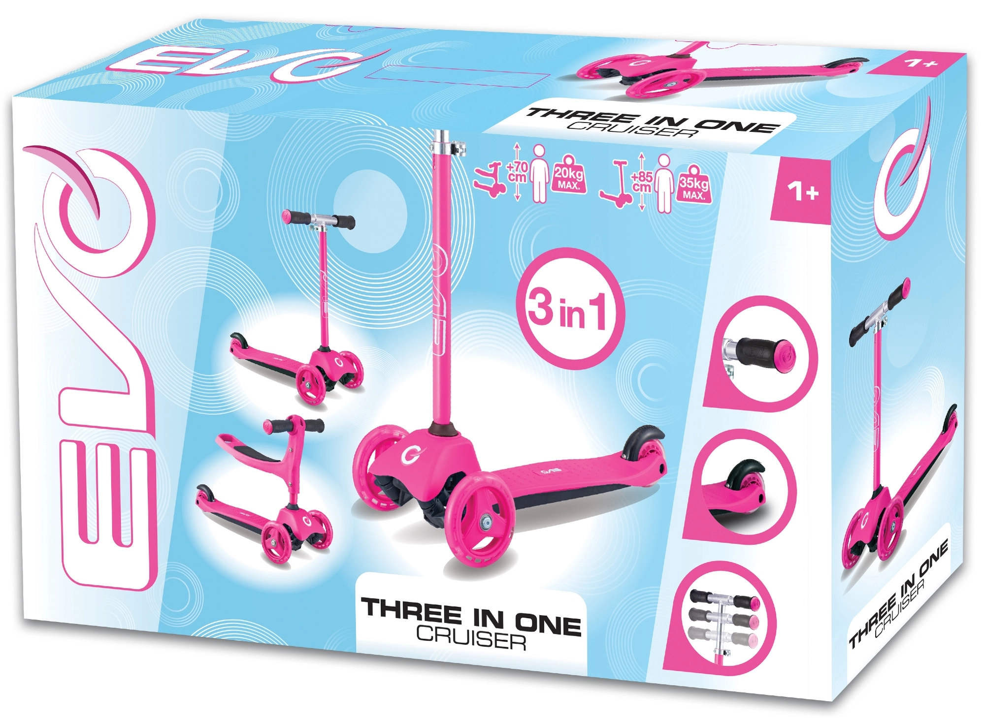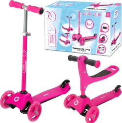 Trotineta pentru copii 2în1 EVO, roz, crește odată cu copilul tău: o poți transforma în câteva clipe din vehicul cu șa într-o trotinetă trică stabilă. Datorită celor două roți din față, platformei joase și direcției prin înclinare, oferă stabilitate excelentă, manevrabilitate ușoară și frânare sigură cu aripa spate. Ghidon cu înălțime reglabilă, roți silențioase cu rulmenți ABEC-5 și platformă antiderapantă pentru o plimbare confortabilă și distractivă atât pentru cei mici, cât și pentru copiii mai mari.