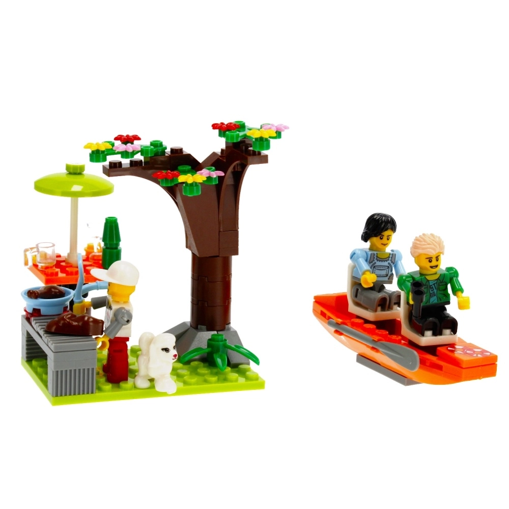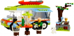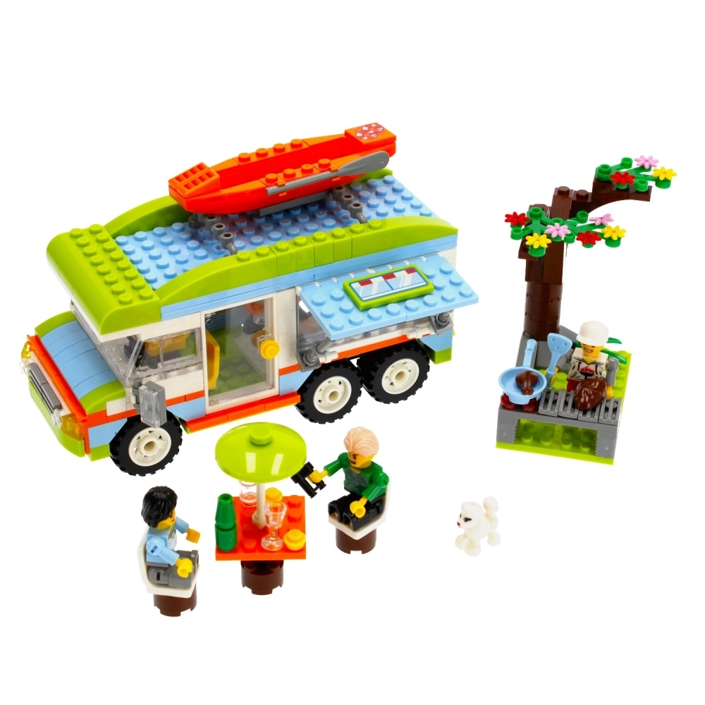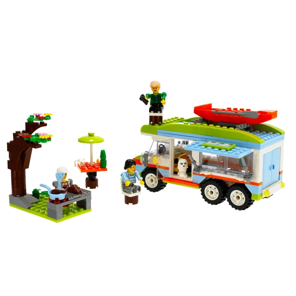 - Set complet de camping – rulotă, minifigurine, câine, masă, grătar, copac și alte echipamente.