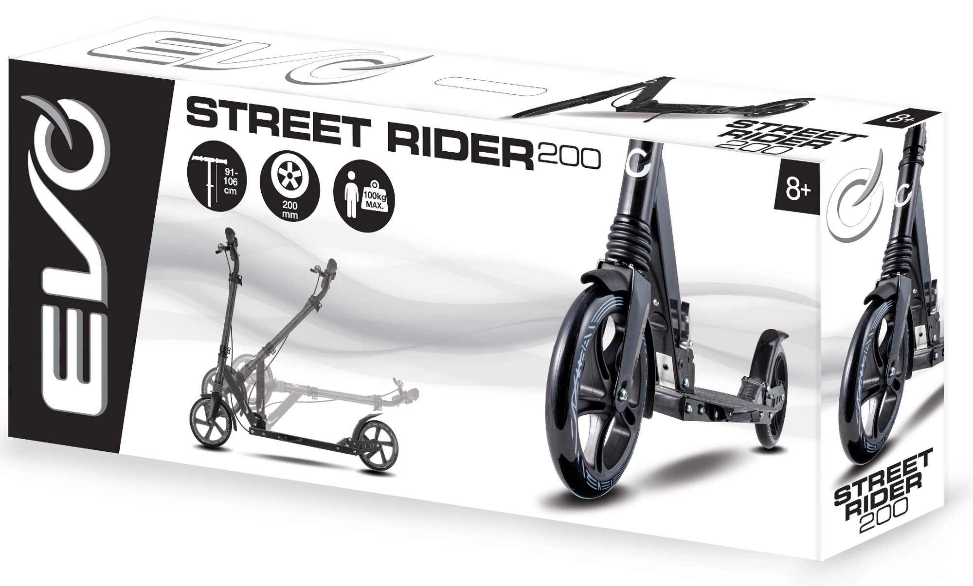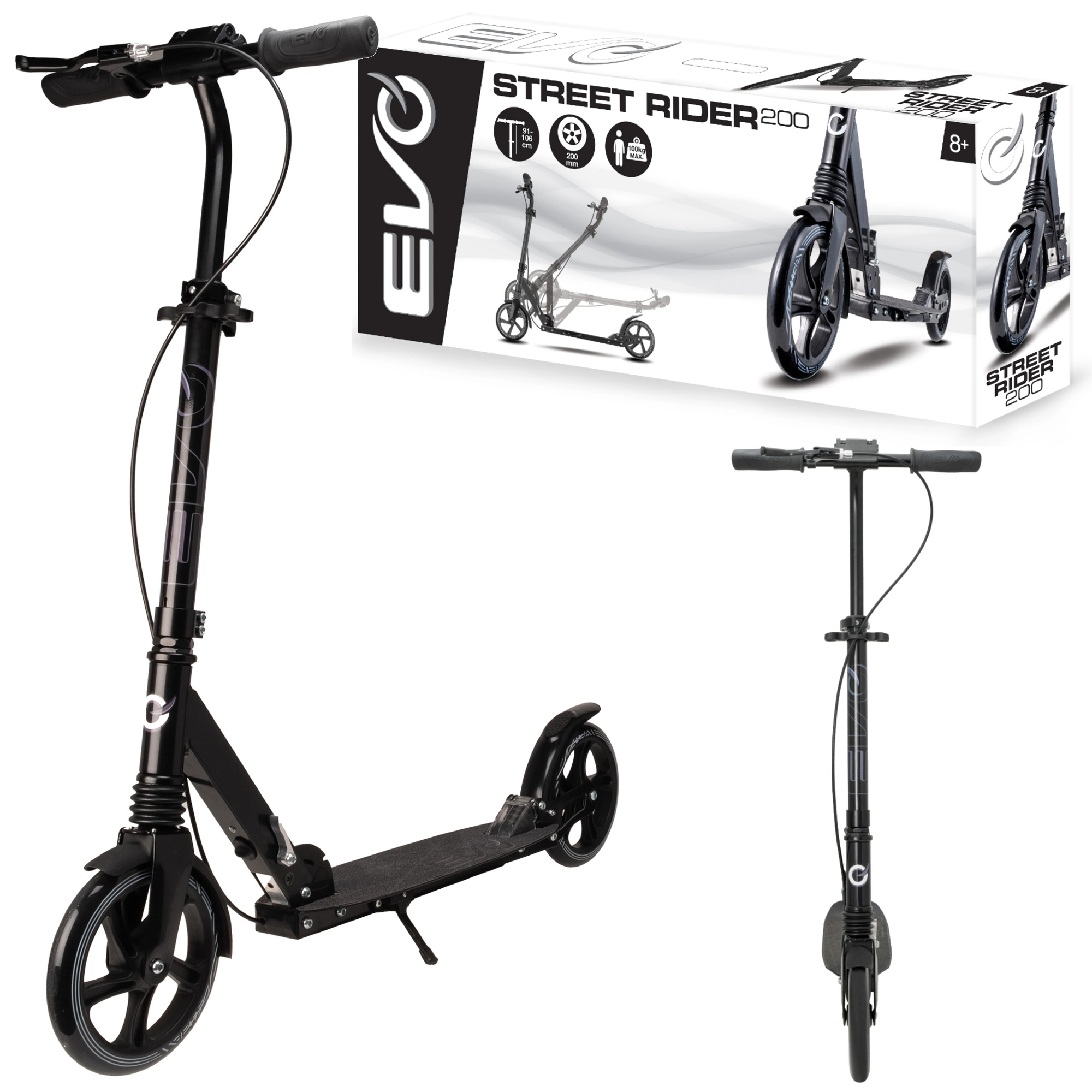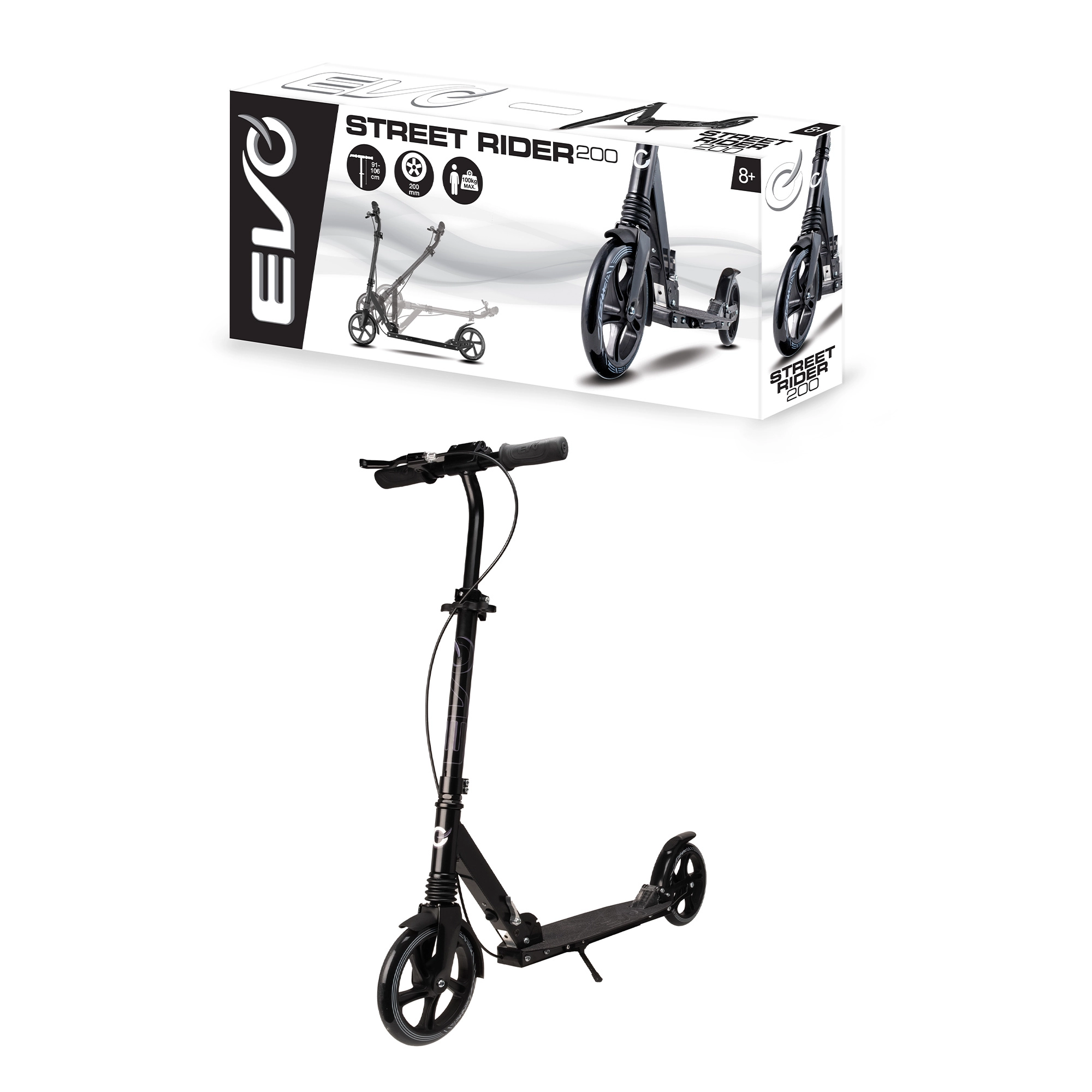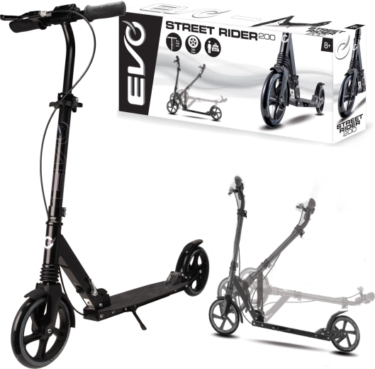 Trotineta ușoară și durabilă EVO Street Rider 200 pentru rideri de la 8 ani oferă roți mari de 200 mm, rezistență la rulare redusă datorită rulmenților ABEC-7, suspensie față și spate, mecanism pliabil pentru transport facil și ghidon reglabil pe înălțime. Oprirea în siguranță este asigurată de frâna spate acționată cu piciorul și frâna față de mână, stabilitatea este sporită de platforma antiderapantă și de cricul integrat.