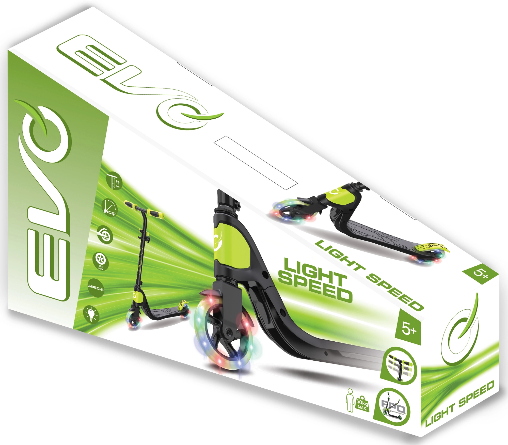 EVO Light Speed este o excelentă trotinetă pentru copii, potrivită pentru ieșiri zilnice pe trotuar și în parc. Înălțimea reglabilă a ghidonului (aprox. 75–80 cm) crește odată cu copilul, roțile luminoase fac fiecare plimbare mai atractivă, iar aripa spate servește și ca frână de picior eficientă. Greutatea redusă și posibilitatea plierii ușurează transportul și depozitarea.