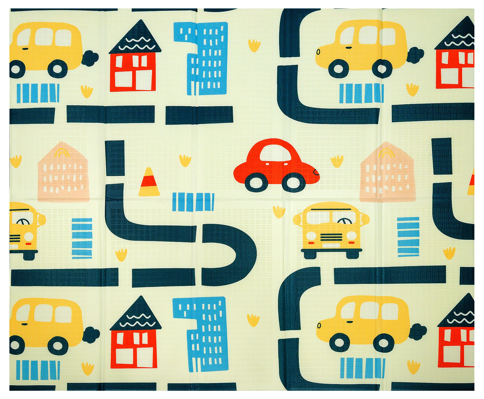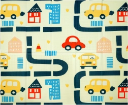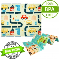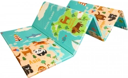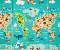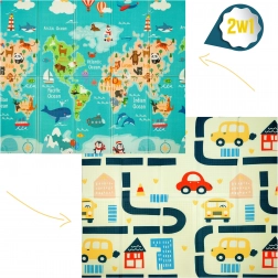 O parte cu harta colorată a lumii și animale, cealaltă cu oraș și drumuri pentru mașinuțe. Două teme educative într-o singură saltea care dezvoltă imaginația și cunoștințele.