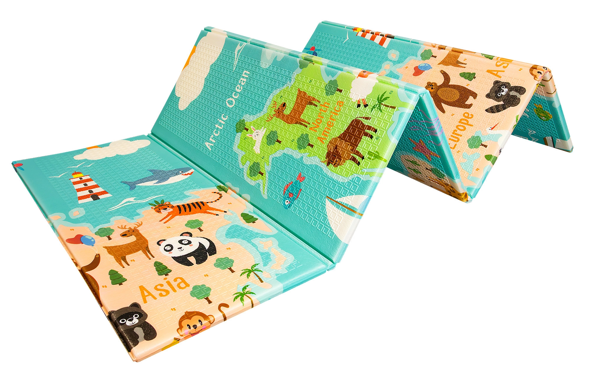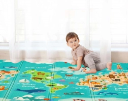 Designul încurajează învățarea prin joacă: harta lumii cu oceane, continente și animale trezește curiozitatea copiilor pentru geografie, în timp ce străduțele cu mașinuțe și clădiri le dezvoltă imaginația și jocul creativ. Salteaua este impermeabilă și igienică – se șterge cu o lavetă umedă, nu reține praful și este potrivită și pentru alergici.
