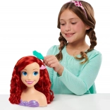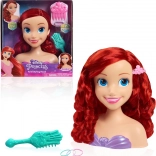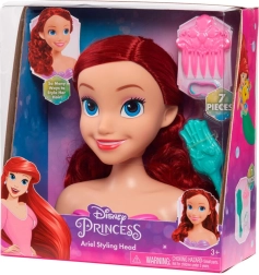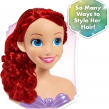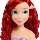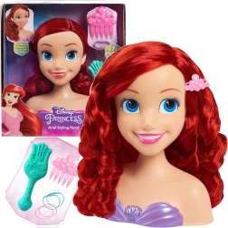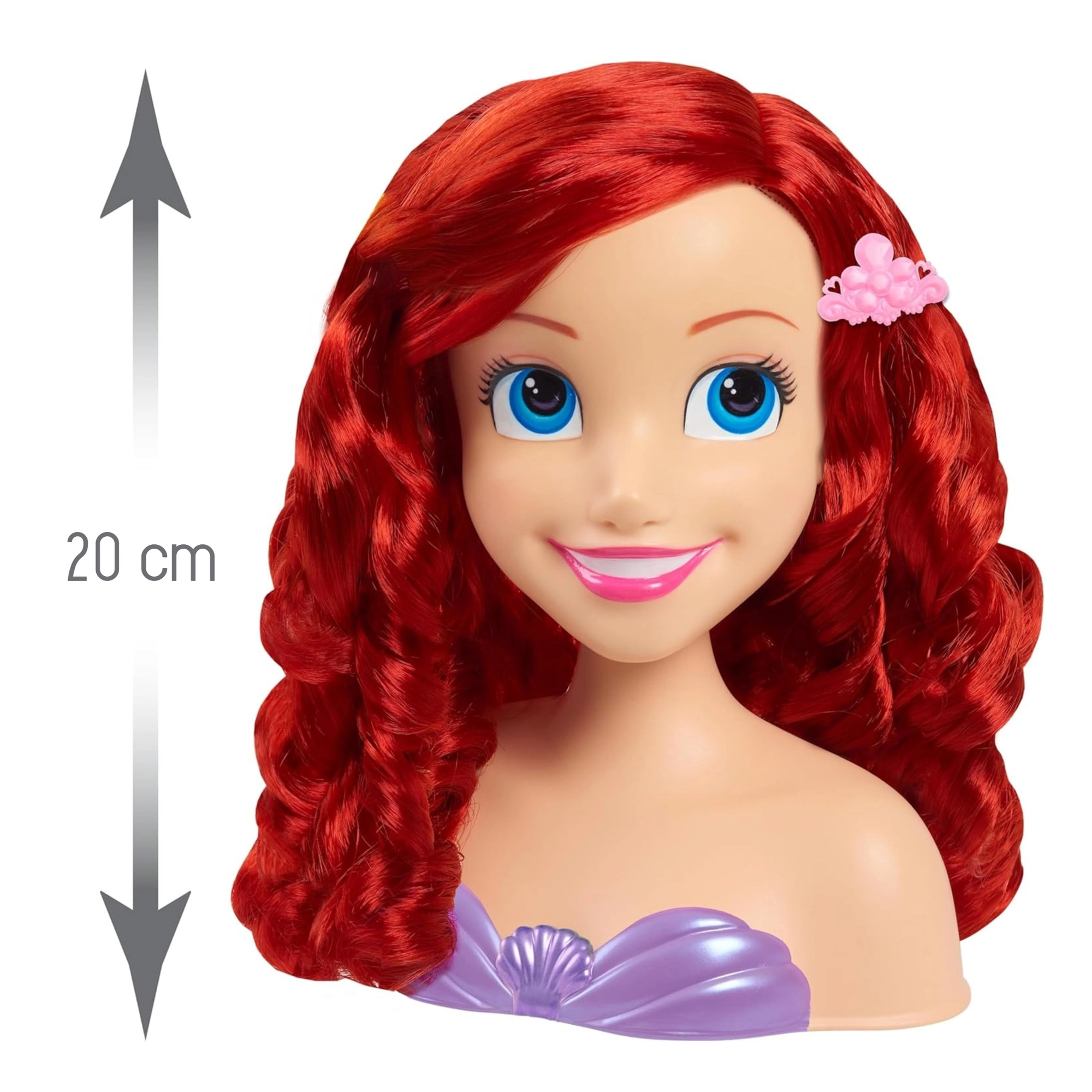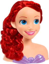Capul de coafat DISNEY Prințesa Ariel redă fidel îndrăgita sirenă, cu ochi albaștri și păr lung, ondulat, roșu. Bustul stabil din plastic, cu top mov în formă de scoici, facilitează coafarea și menține capul fix pe loc, pentru ca micuții să se bucure pe deplin de jocul de coafor.