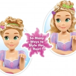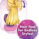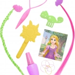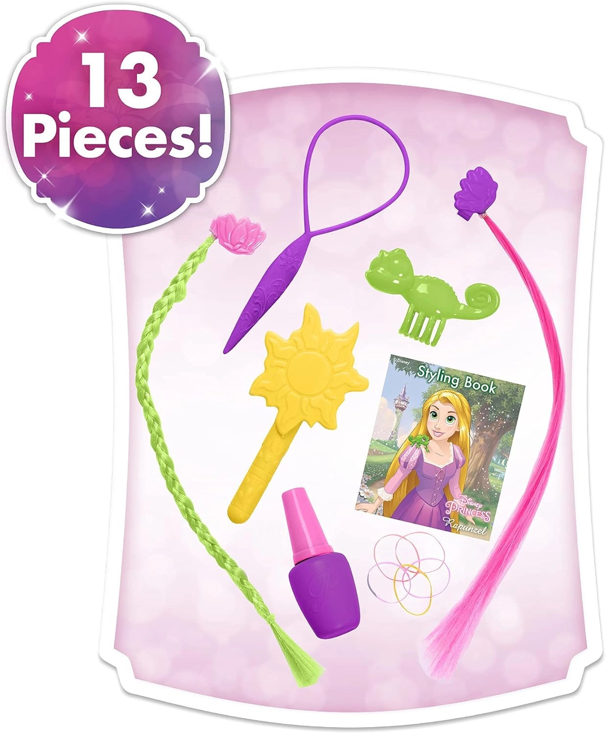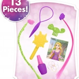 Include un set de 13 piese cu instrumente practice: perie, instrument pentru coafuri, elastice colorate, clame cu șuvițe, agrafe tematice și o mică carte de idei pentru inspirație rapidă. Accesoriile pot fi folosite atât pe capul lui Rapunzel, cât și în părul copilului.