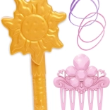 În set găsești perie în formă de soare, pieptene decorativ și elastice pentru coafuri de zi cu zi sau pentru balurile din regat. Joaca cu capul de styling sprijină dezvoltarea creativității, coordonarea mână–ochi și antrenează răbdarea la realizarea împletiturilor și buclelor.