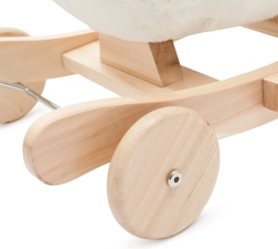 Corpul din pluș, scaunul capitonat și mânerele din lemn oferă confort și o prindere mai sigură chiar și pentru cei mai mici călăreți.