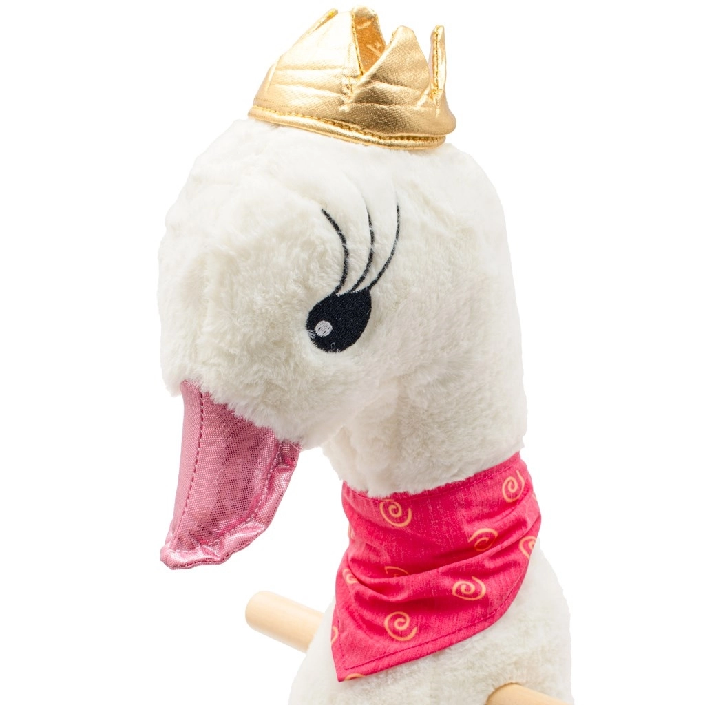 Această elegantă lebădă albă cu detalii roz și coroniță aurie îi va încânta pe micile prințese și pe părinții lor. Jucăria este realizată din material moale și plăcut, în timp ce baza din lemn cu roți permite alternarea ușoară între balansare și mers. Melodia integrată susține dezvoltarea senzorială și adaugă o nouă dimensiune jocului.