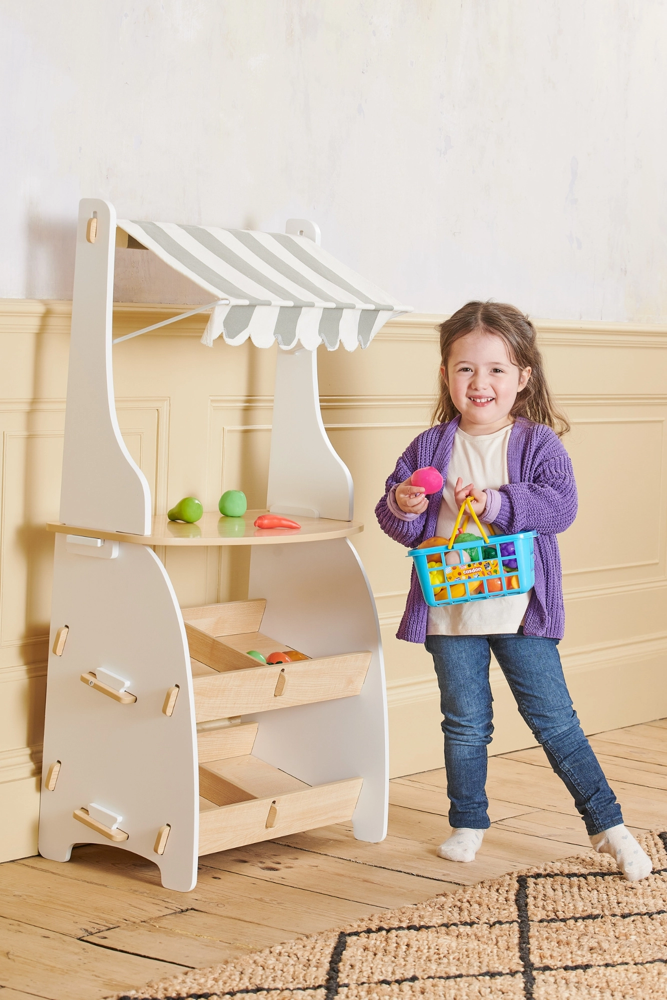 Setul este conceput pentru mâini mici și susține motricitatea fină, recunoașterea culorilor și cunoștințele de bază despre alimente. Se potrivește de minune în bucătăria de jucărie, pentru jocul de-a clienții și vânzătorii și ca extindere a altor seturi.