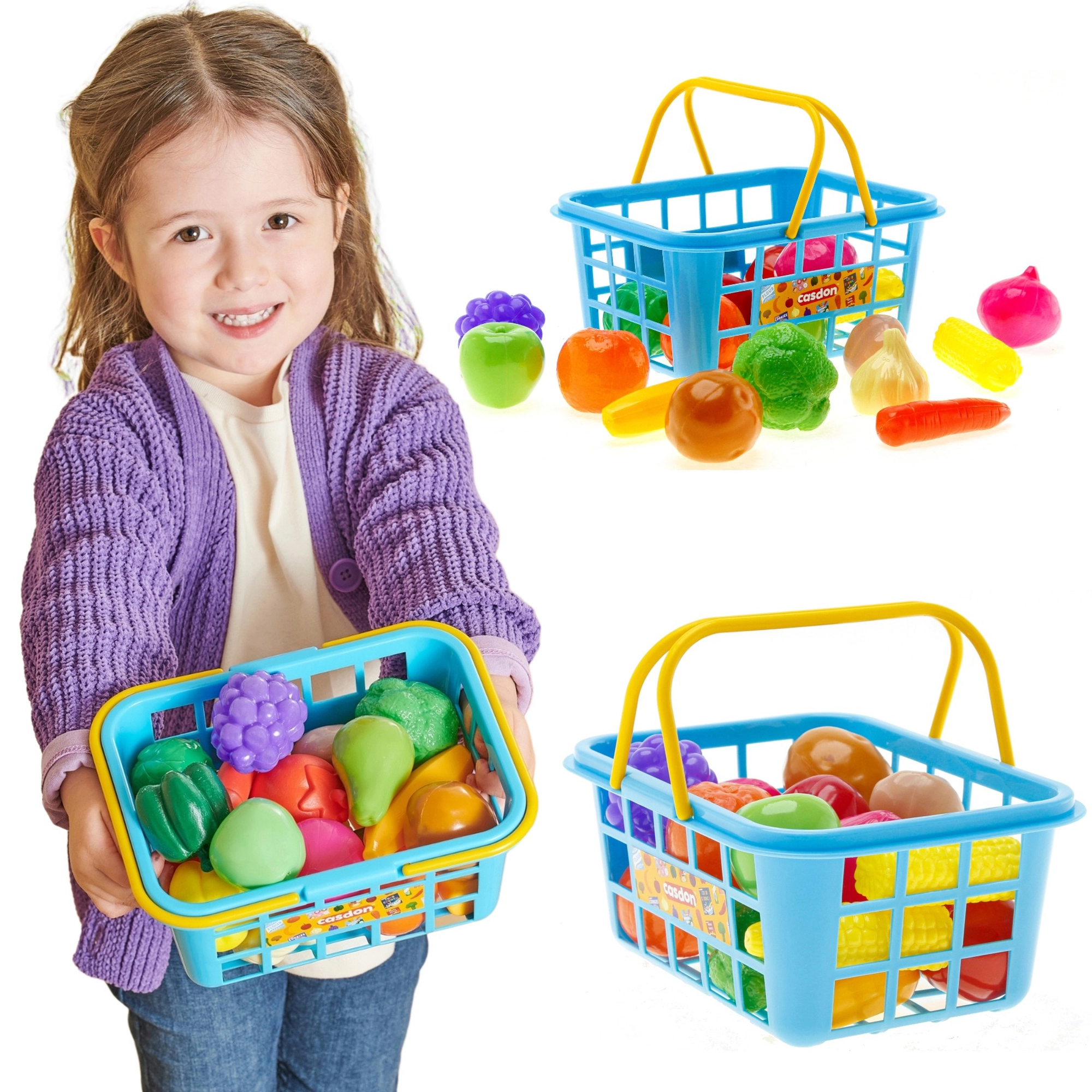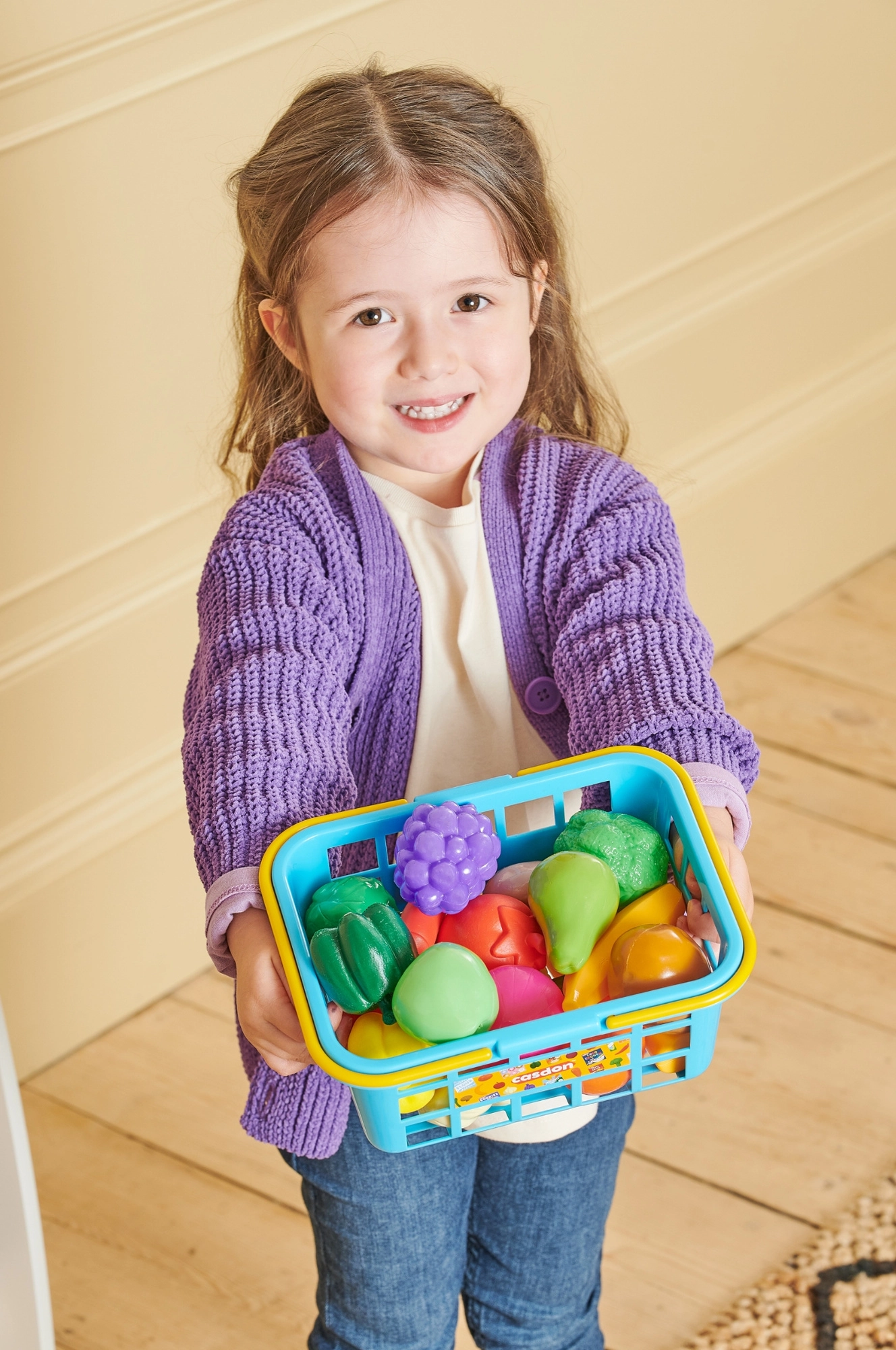 Coșul de cumpărături pentru copii CASDON, de culoare albastră cu mânere galbene, este plin cu fructe și legume din plastic colorate pentru un joc realist de magazin. Ideal pentru dezvoltarea imaginației, abilităților sociale și motricității fine. Include, de exemplu, roșie, castravete, ardei, porumb, banană și struguri. Dimensiunea coșului este adaptată mâinilor copiilor și este sigur pentru copiii de la 2 ani. Un accesoriu grozav pentru alte seturi de magazin CASDON și pentru joaca de-a cumpărăturile.