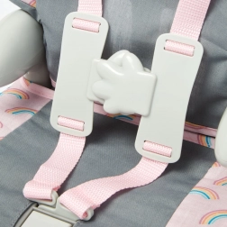Execuția gri–roz cu model de curcubeu este nu doar adorabilă, ci și practică – materialele sunt durabile și plăcute la atingere. Scaunul este potrivit pentru păpuși de până la 46 cm și este ideal pentru joacă acasă, în călătorii sau în timpul hrănirii păpușilor.