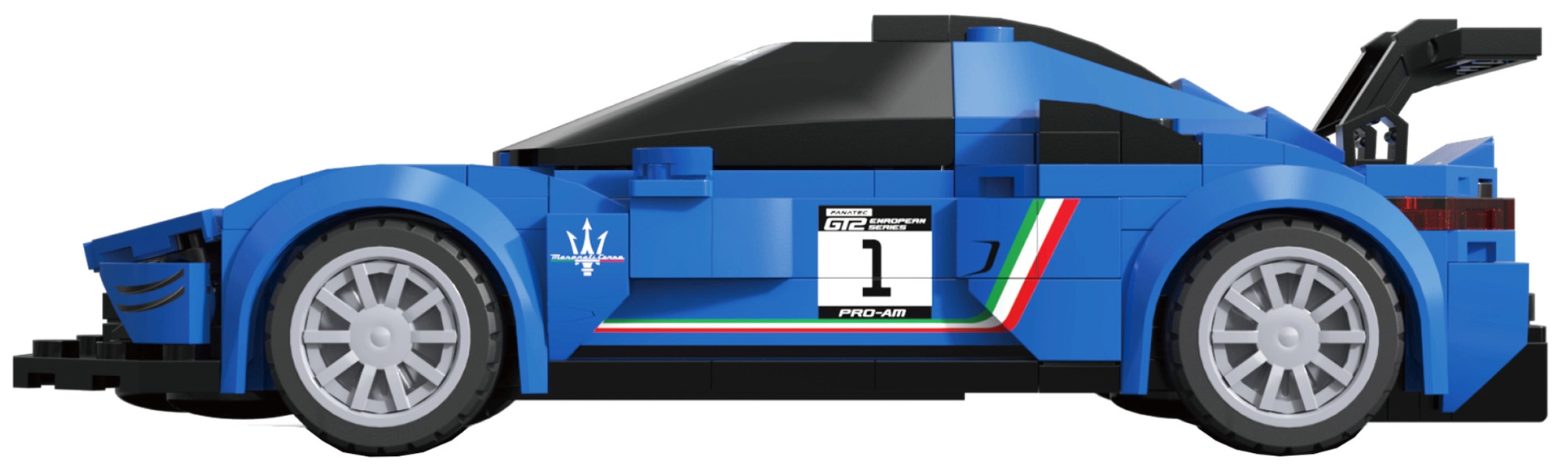 Liniile fidele ale caroseriei, eleronul de curse și inscripțiile cu numărul mașinii subliniază aspectul realist al modelului MASERATI MC20 GT2.