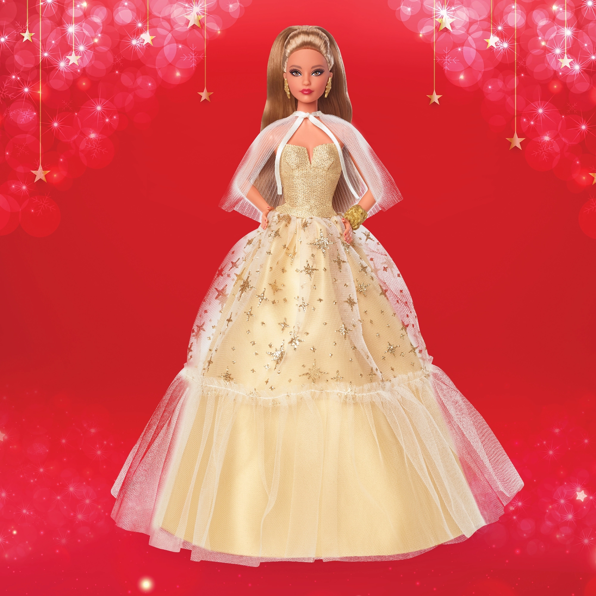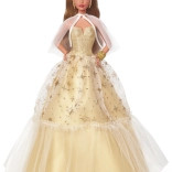 Elegantă păpușă de colecție BARBIE pentru a 35-a aniversare, în rochie din satin în nuanță de șampanie cu fustă din tiul presărată cu stele aurii. Nu lipsesc pelerina plisată, transparentă, bijuteriile aurii și detaliile impecabile ale machiajului și manichiurii. Un cadou de Crăciun ideal și o piesă deosebită pentru orice colecție.