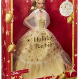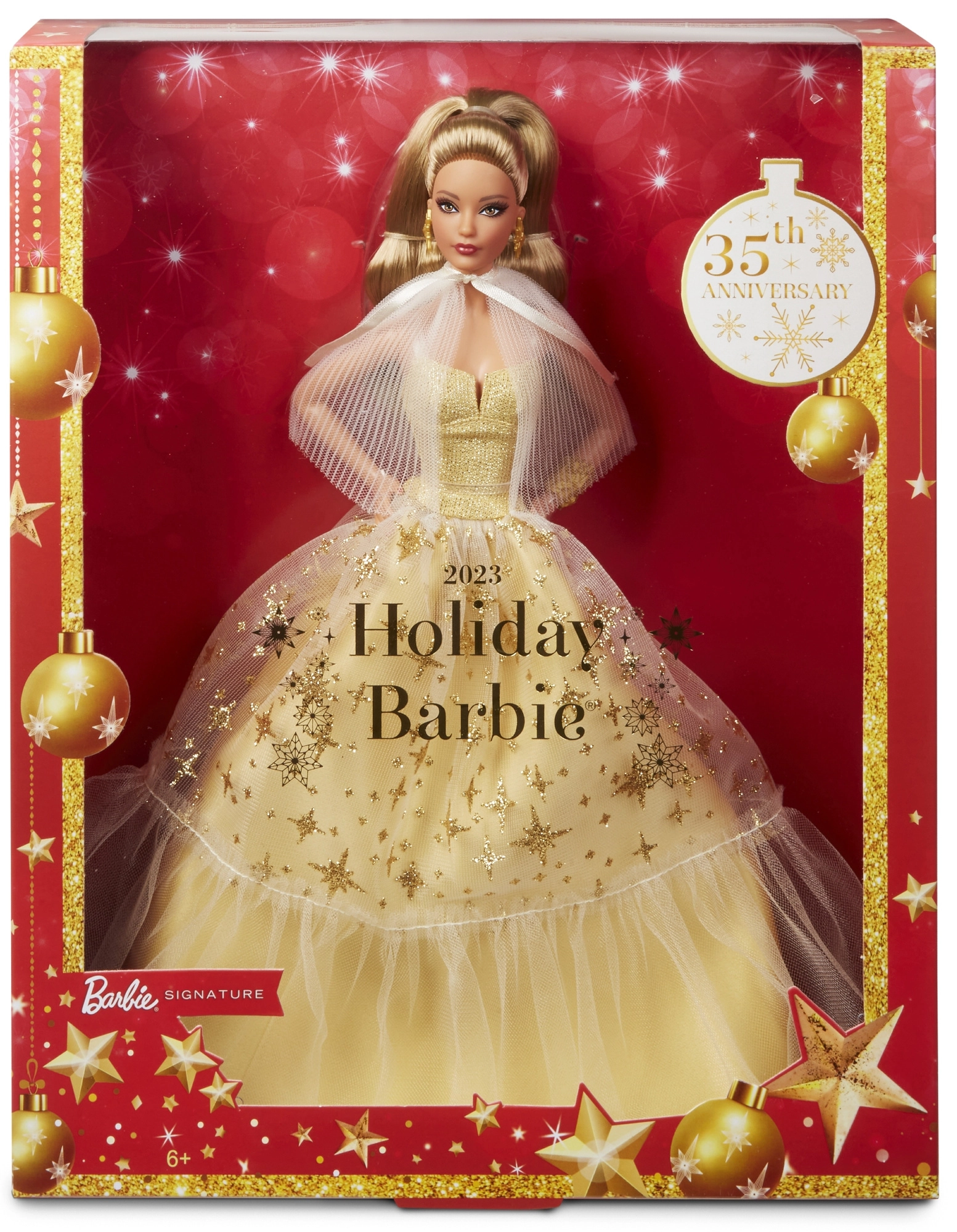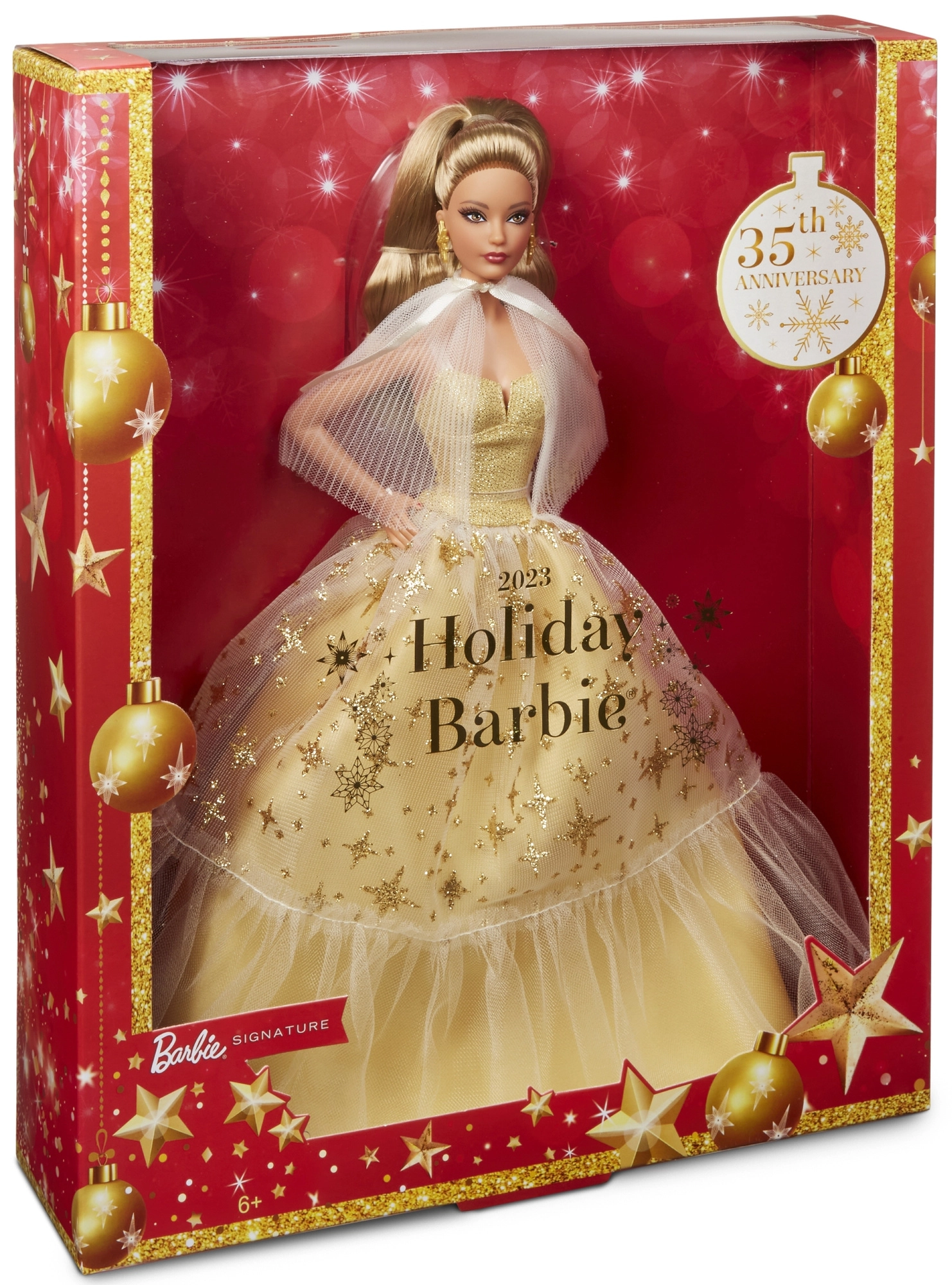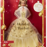Această ediție de colecție excepțională sărbătorește 35 de ani ai iconicei serii Barbie. Păpușa impresionează printr-un aspect sofisticat: păr blond ușor mai închis, ochi căprui strălucitori, iar expresia feței îi subliniază caracterul matur. Cercei aurii eleganți și unghii roșii completează stilul festiv.