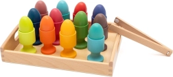 Penseta din lemn îi motivează pe copii să prindă cu precizie și să mute ouăle în cupe, întărind degetele și coordonarea mână–ochi.
