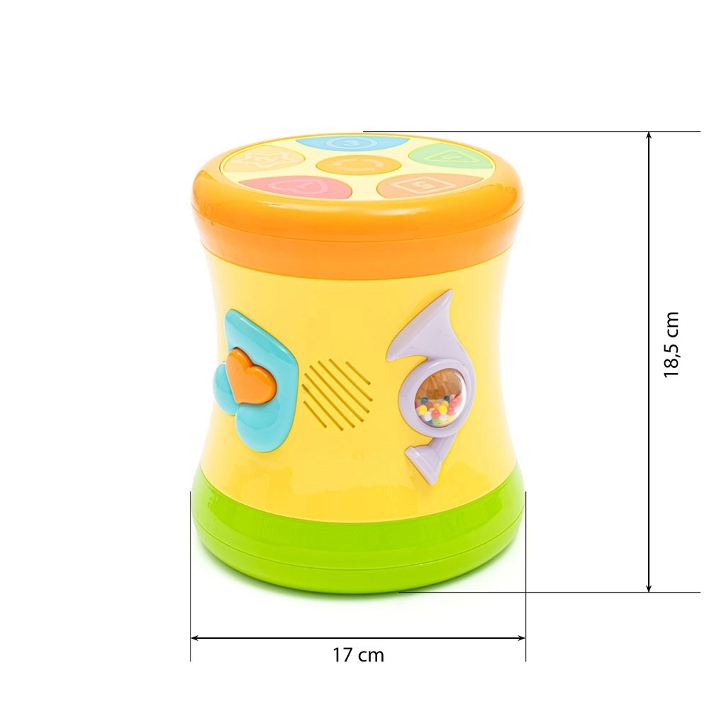 Toba interactivă cu două fețe BABY MIX, în varianta galbenă, îi va încânta pe copii de la 10 luni. Oferă 8 melodii, 12 cântecele vesele, efecte luminoase și sunete de tobă, care susțin auzul, văzul, motricitatea fină și coordonarea mână–ochi. Distracție și învățare într-un singur produs.