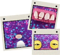 Plușul FUGGLER Squidge de la Spin Master impresionează la prima vedere prin aspectul său neobișnuit. Corpul mov este decorat cu pete contrastante în nuanțe de albastru și roz, creând un efect artistic, chiar abstract. Elementul dominant este dentura comic-înfricoșătoare, care oferă jucăriei un farmec și un umor aparte.