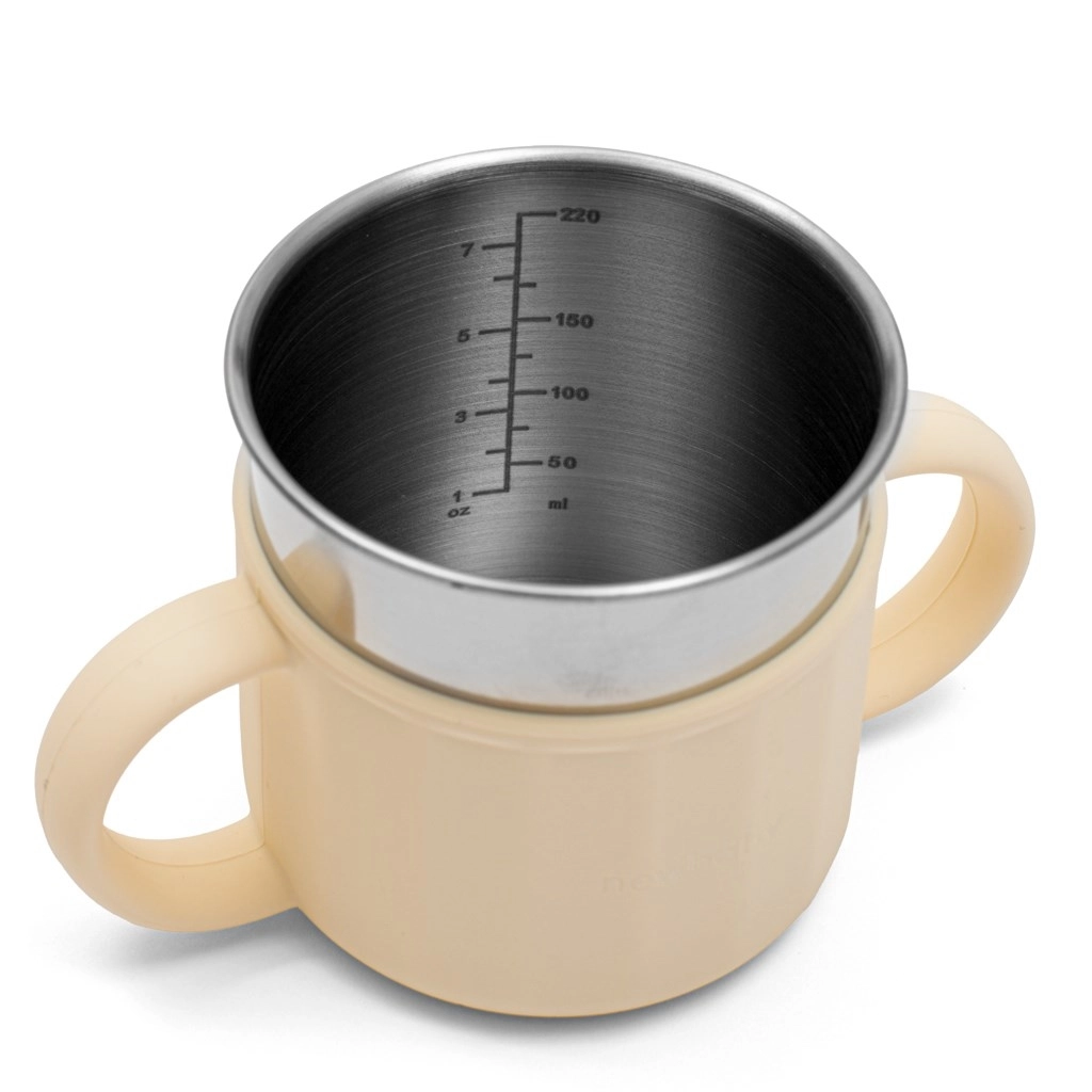 Descoperiți cănuța stilată și funcțională 2 în 1 NEW BABY, care crește odată cu copilul dumneavoastră. Combinația de 50% silicon moale și 50% oțel inoxidabil asigură durabilitate, igienă și curățare ușoară. Datorită celor două mânere laterale, cănuța se ține excelent chiar și de cei mai mici, iar designul discret în culoare bej se potrivește în orice interior.
