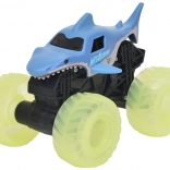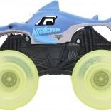 Îndrăgitul Megalodon, inspirat de rechinul preistoric, impresionează prin detalii realiste ale caroseriei în tonuri albastru-gri, cu înotătoare și dinți care accentuează aspectul agresiv. Roțile mari, transparente, și șasiul robust sunt ideale pentru cascadorii acasă sau în deplasare.