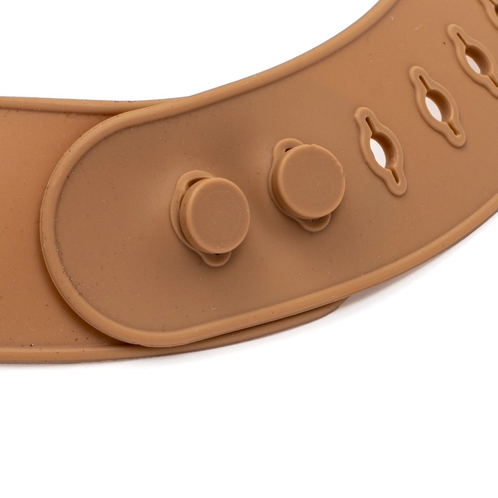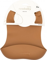 Baveta practică din silicon NEW BABY, de culoare maro, protejează hainele în timpul hrănirii datorită buzunarului adânc care prinde firimiturile și lichidele. Este realizată din silicon moale și sigur, are închidere reglabilă pentru purtare confortabilă, se curăță ușor și este rezistentă și flexibilă pentru utilizare zilnică.