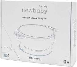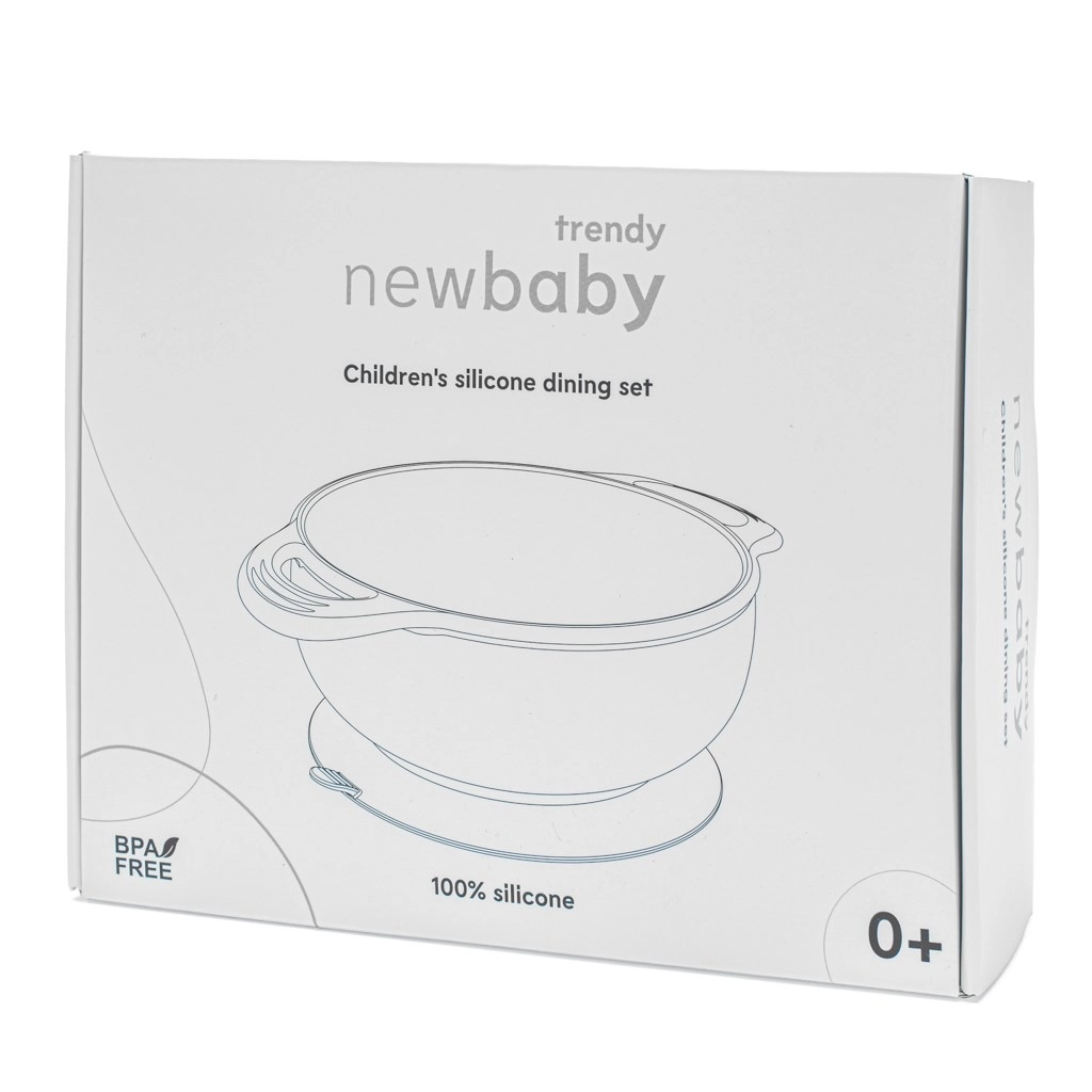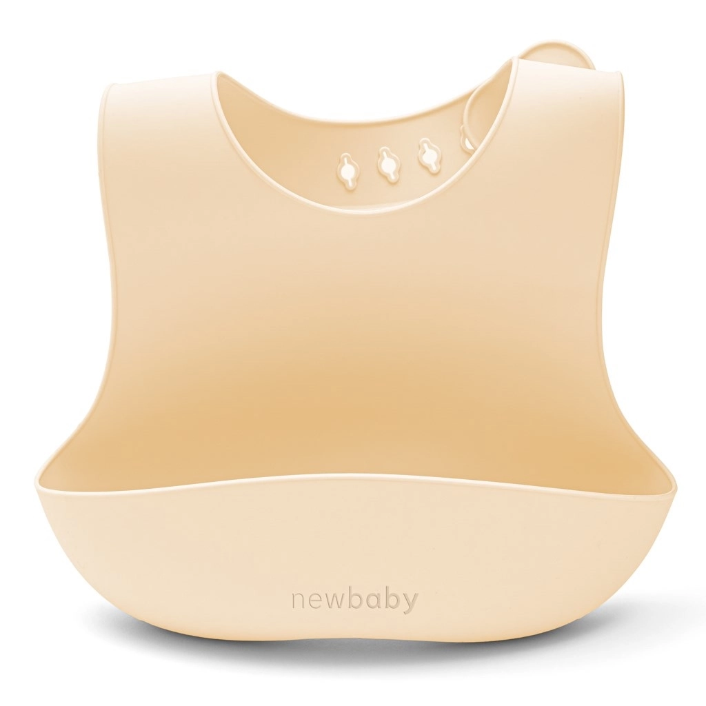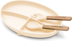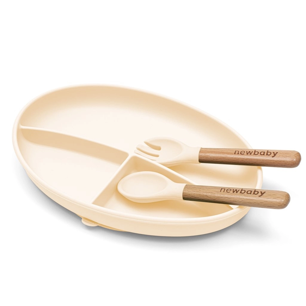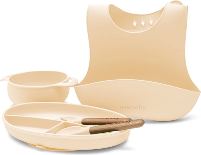 Set de masă din silicon pentru copii, practic și elegant, NEW BABY, în culoare bej, ușurează hrănirea zilnică și mâncatul independent. Include un farfurie compartimentată cu ventuză, bol cu ventuză și mânere, bavetă cu buzunar și tacâmuri cu mâner din lemn. Fabricat din silicon fără BPA, potrivit pentru cuptorul cu microunde și mașina de spălat vase.