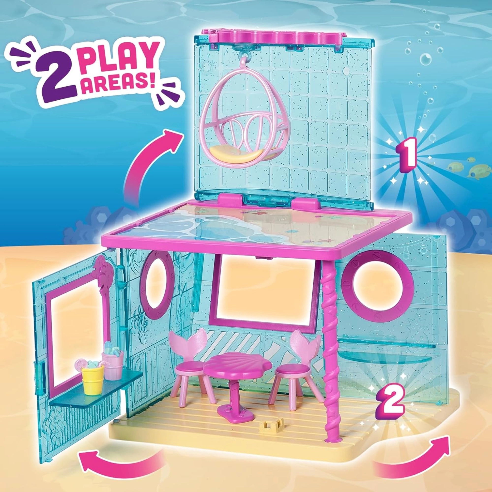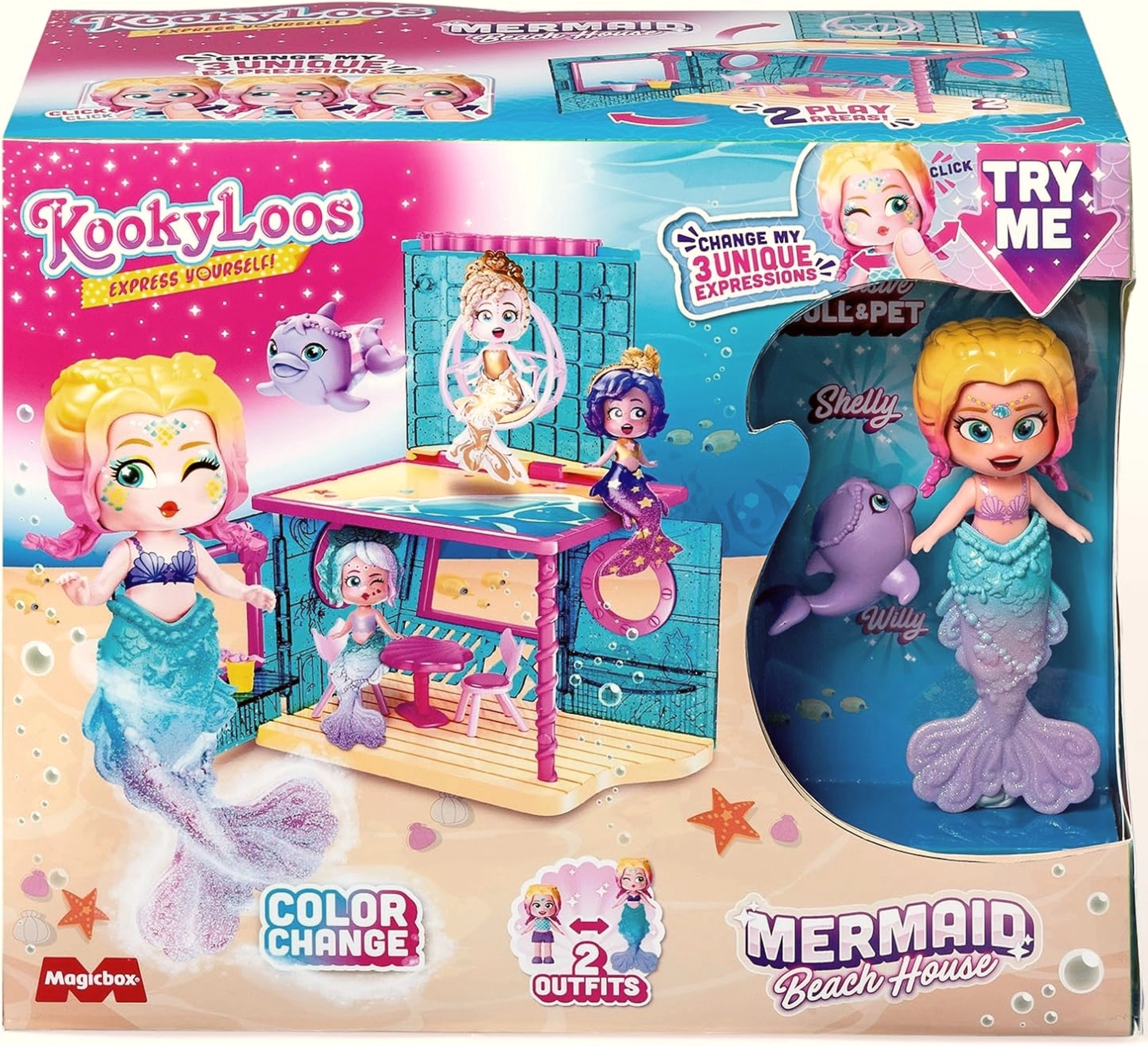 Pășește în lumea subacvatică cu KookyLoos MERMAID – adorabila sirenă Shelly, care are articulații mobile, 3 expresii ale feței și o coadă sclipitoare spectaculoasă. Deschide căsuța de plajă pentru sirene, decoreaz-o după bunul plac și bucură-te de povești nesfârșite alături de prietenul de nădejde – delfinașul.